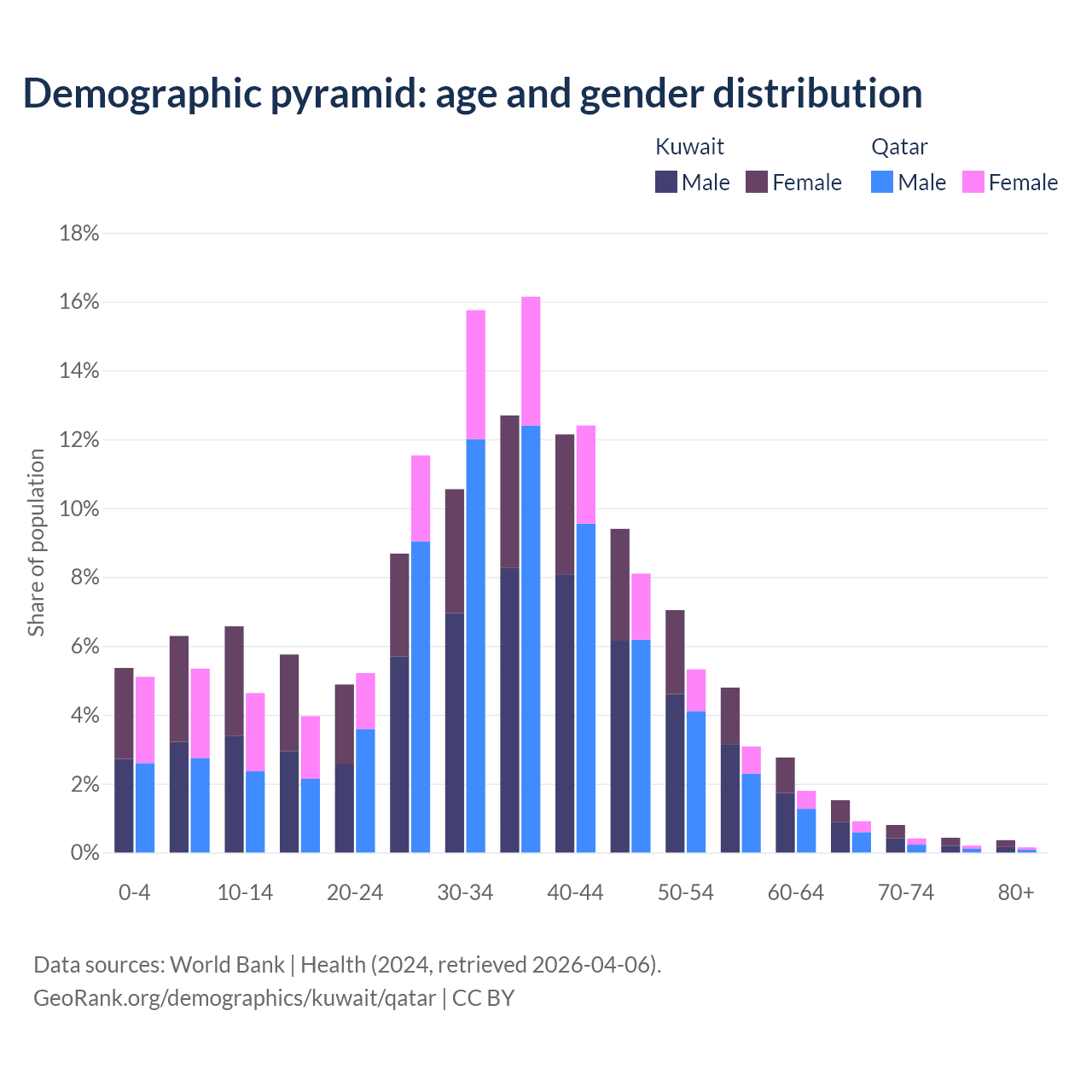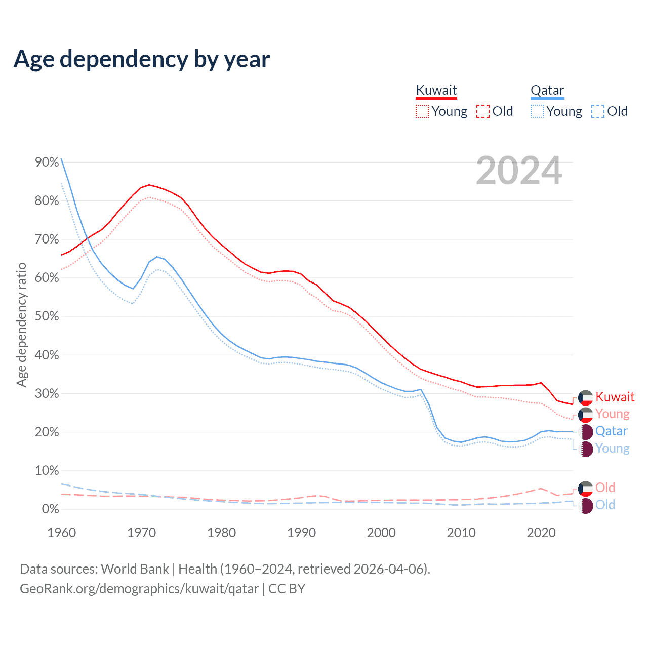 - Kuwait is ranked 71/196 by median age (oldest to youngest) vs 78/196 for Qatar.