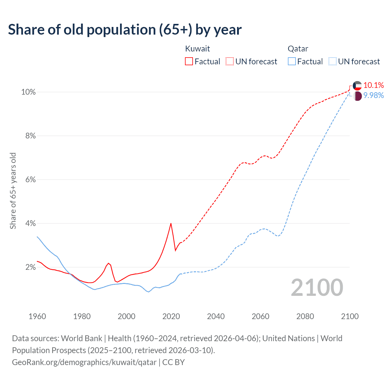 The share of older people aged 65 and over is 3.1% in Kuwait and 1.68% in Qatar. Life expectancy in Kuwait compared to Qatar .
