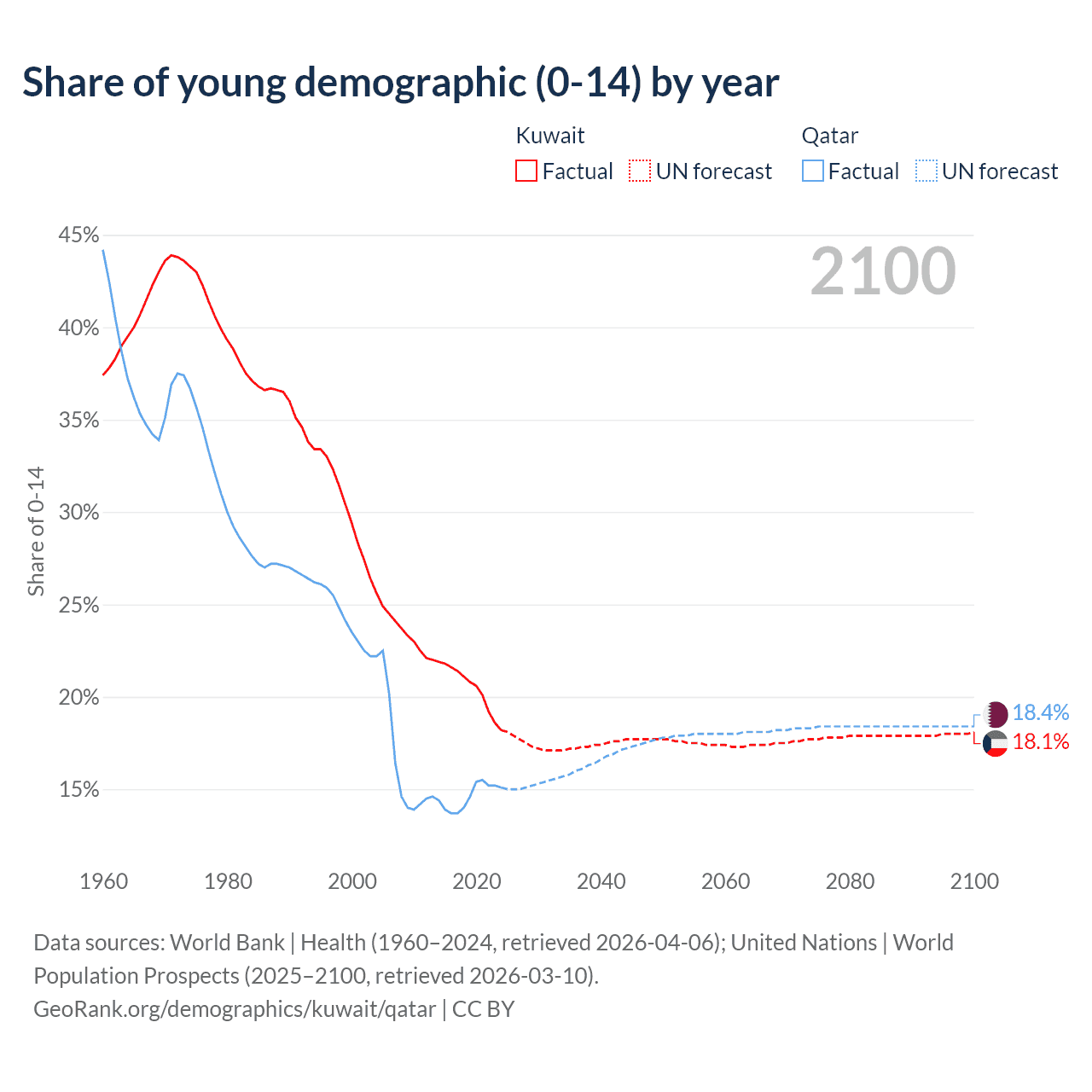 - As of 2026, the population of Kuwait is 5.1M vs 3M in Qatar - 1.7 times difference.