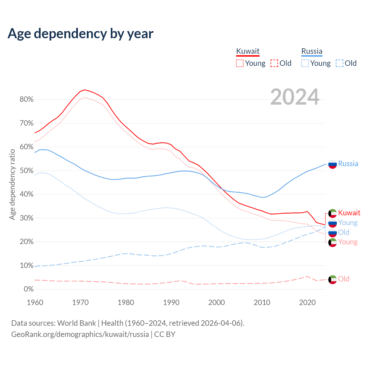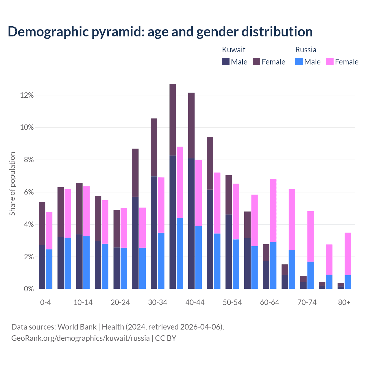 - Kuwait is ranked 71/196 by median age (oldest to youngest) vs 42/196 for Russia.