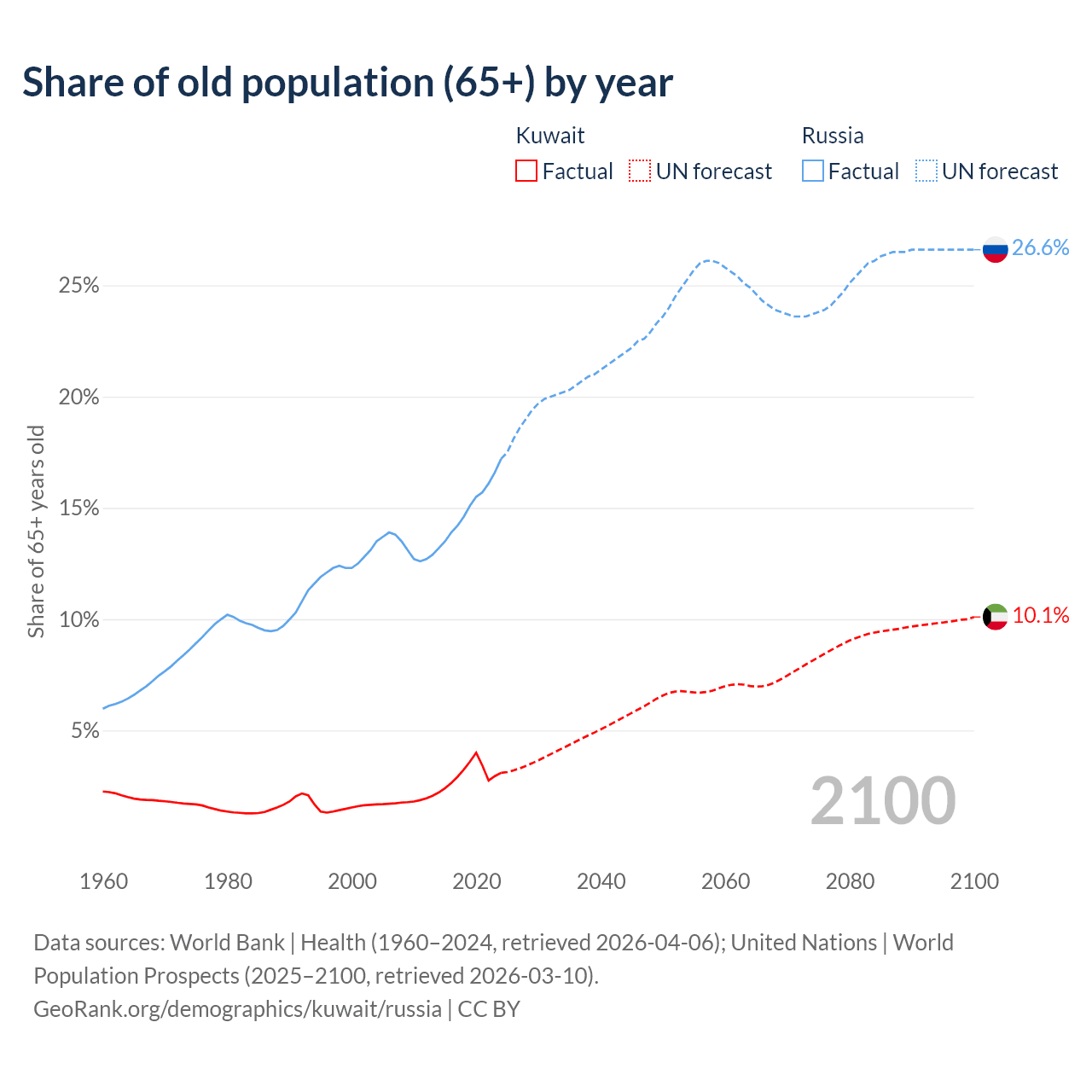 The share of older people aged 65 and over is 3.1% in Kuwait and 17.2% in Russia. Life expectancy in Kuwait compared to Russia .