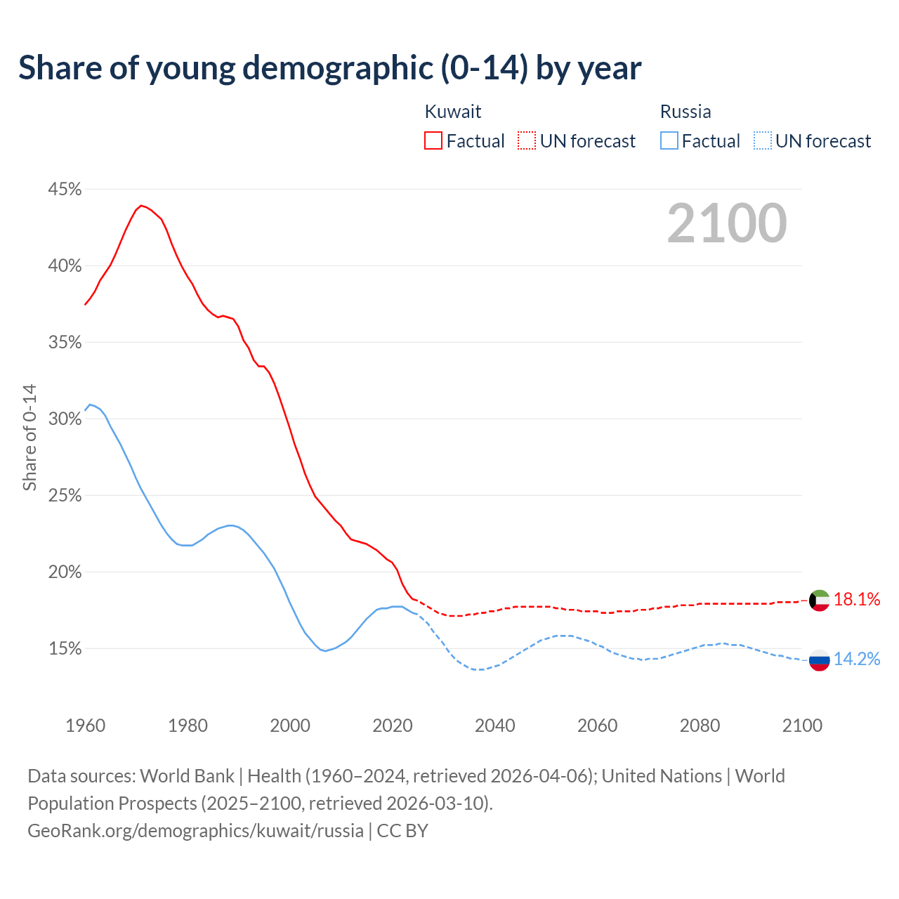 - The share of young demographic (0-15 years old) in Kuwait is 18.2% vs 17.3% in Russia.