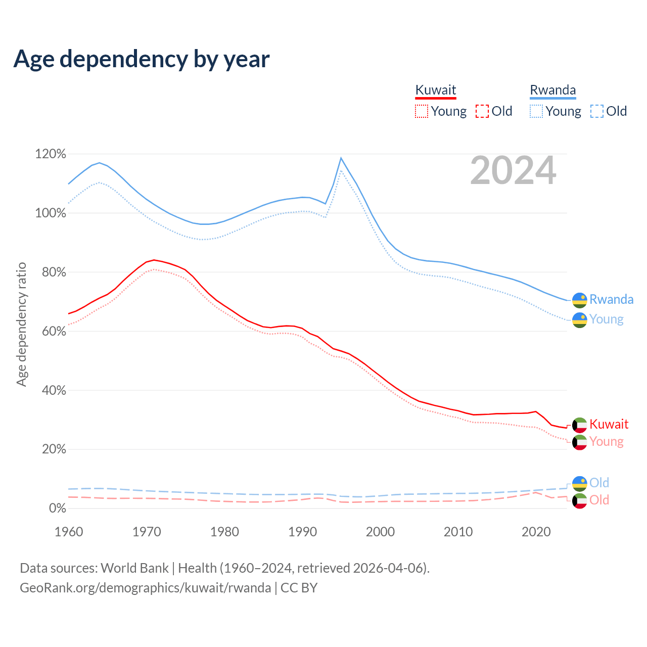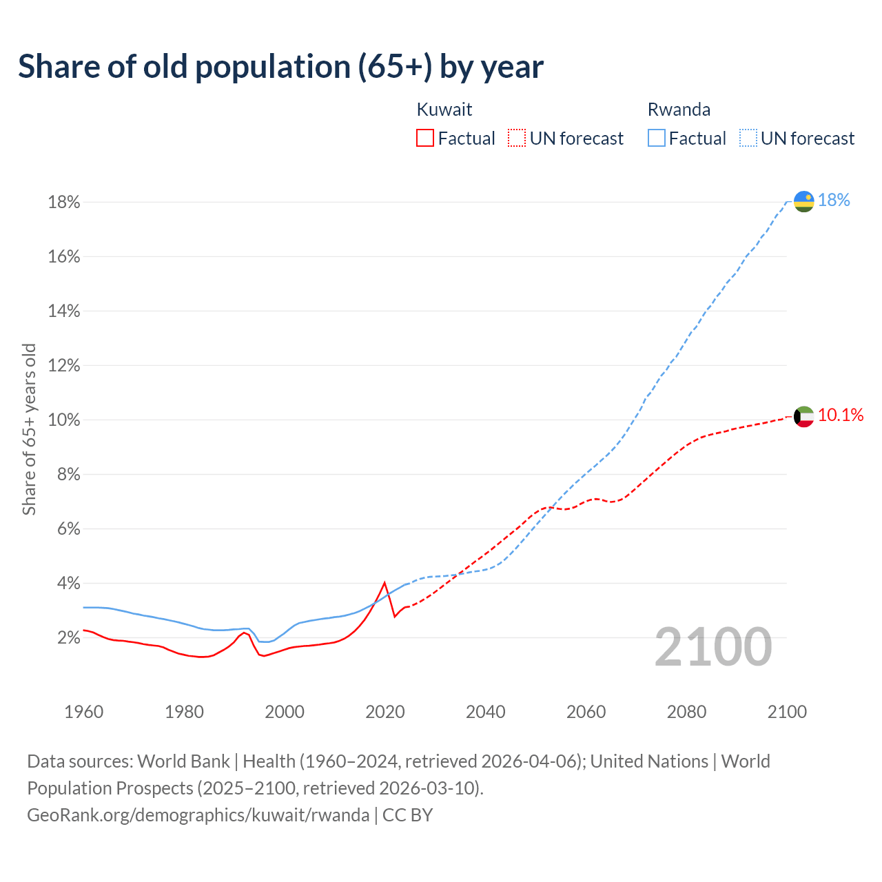 The share of older people aged 65 and over is 3.1% in Kuwait and 3.93% in Rwanda. Life expectancy in Kuwait compared to Rwanda .