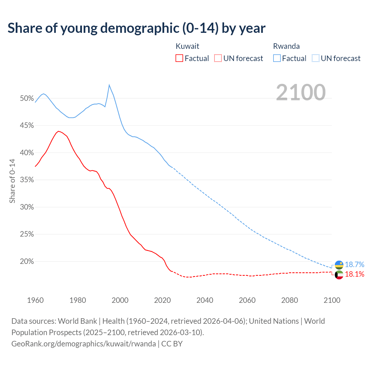 - The share of young demographic (0-15 years old) in Kuwait is 18.2% vs 37.4% in Rwanda.