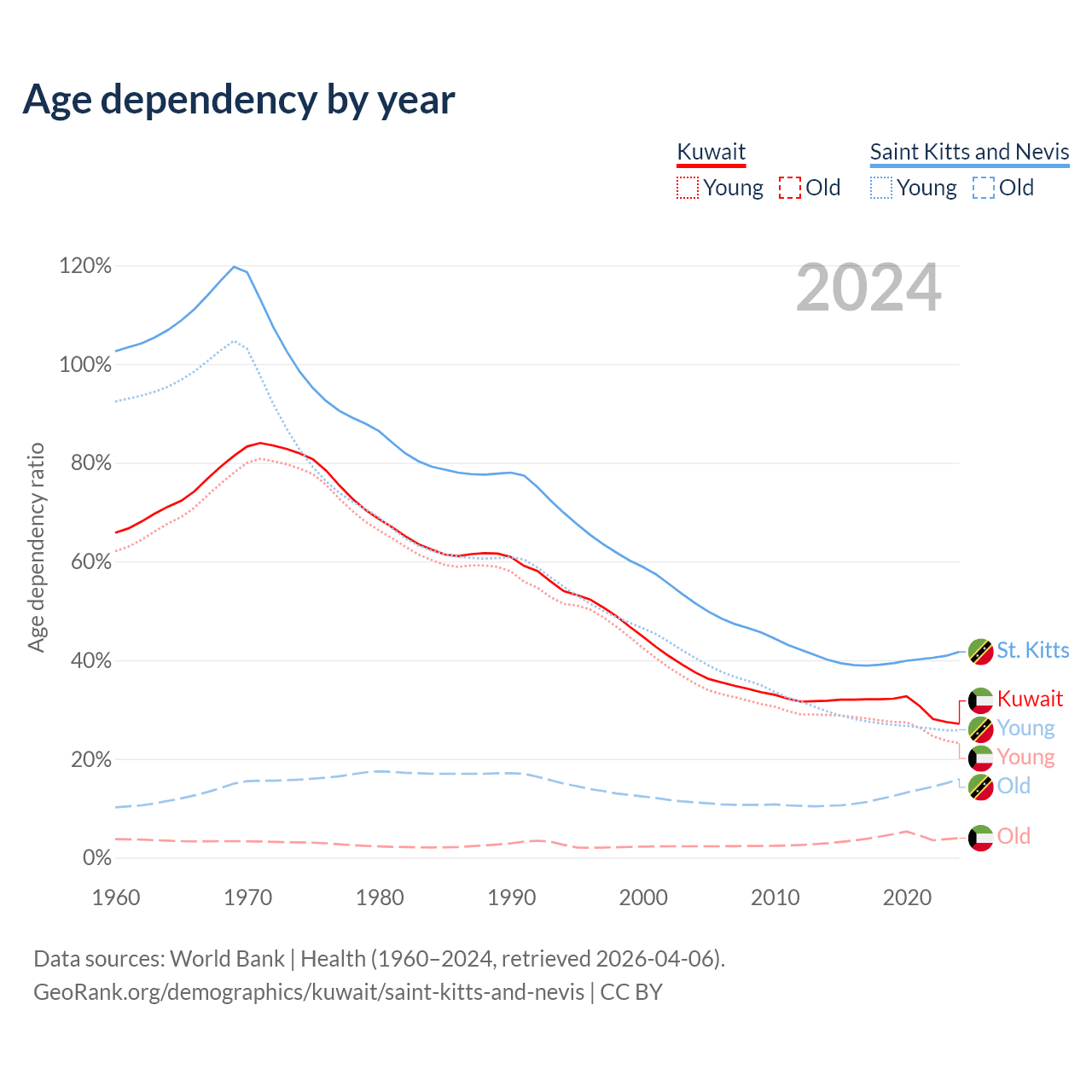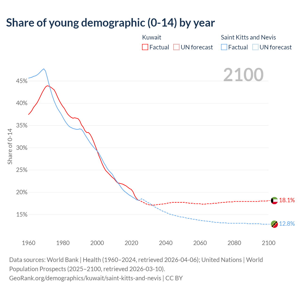 - The share of young demographic (0-15 years old) in Kuwait is 18.2% vs 18.2% in Saint Kitts and Nevis.