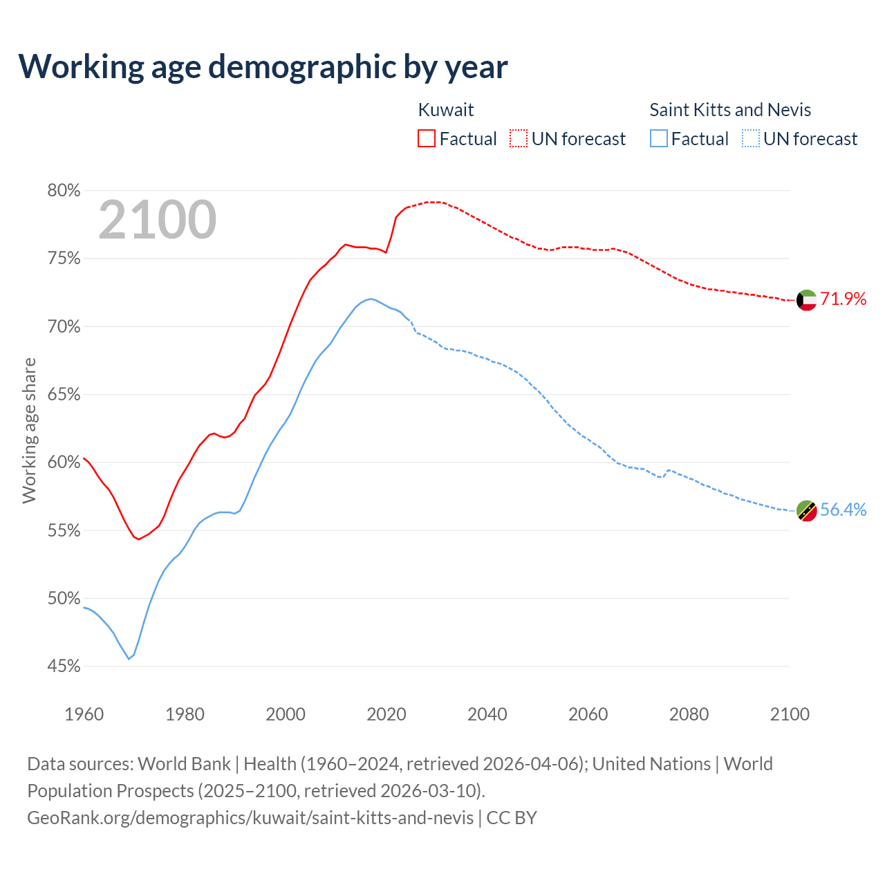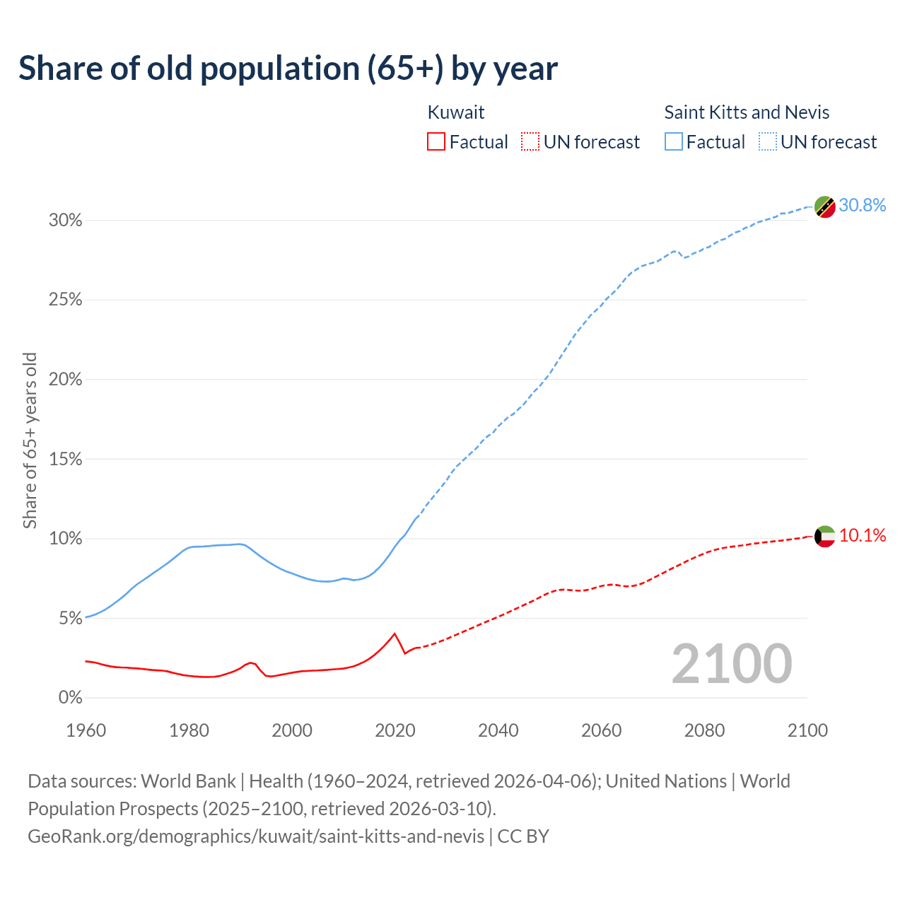 The share of older people aged 65 and over is 3.1% in Kuwait and 11.2% in Saint Kitts and Nevis. Life expectancy in Kuwait compared to Saint Kitts and Nevis .