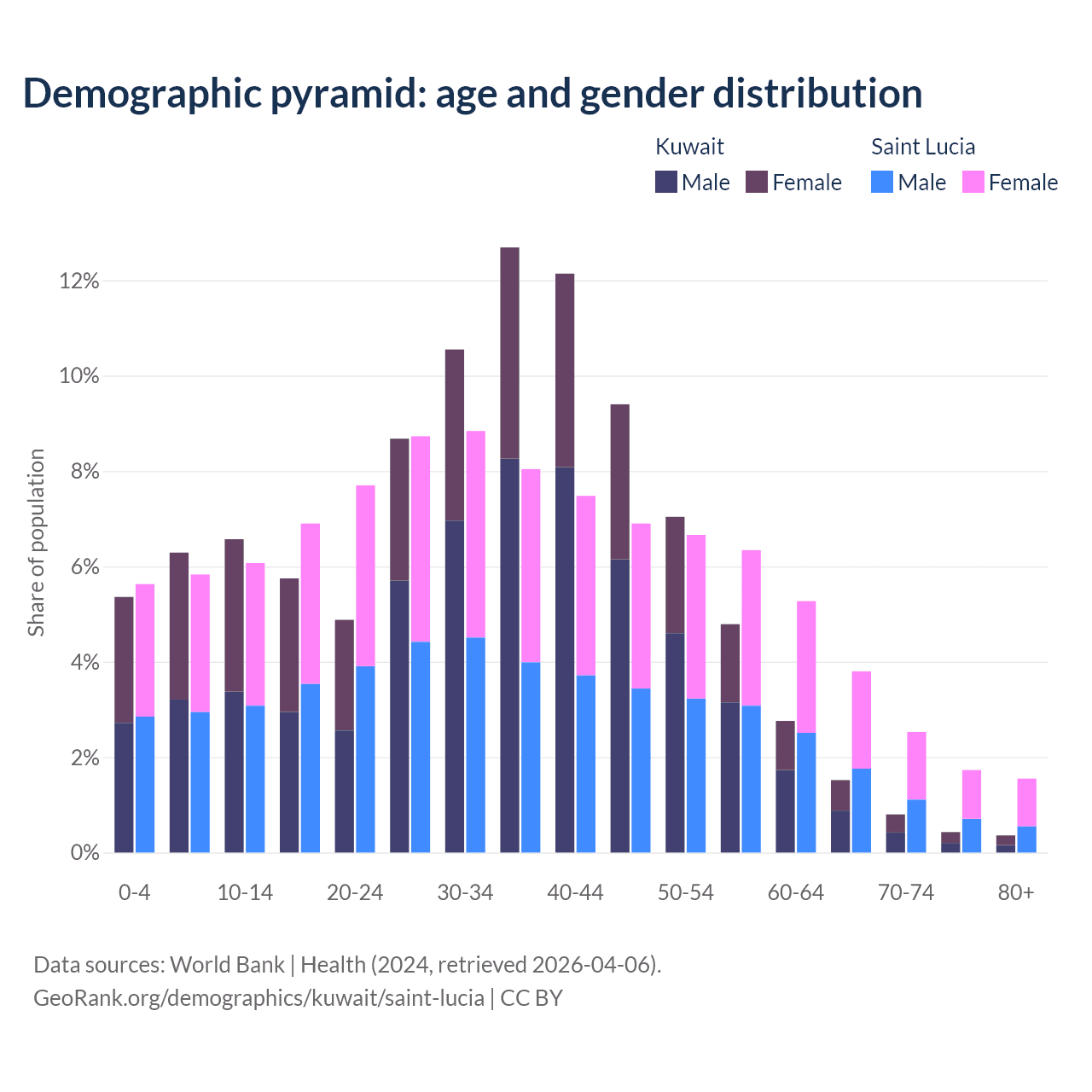 - The share of old-age demographic (65+) in Kuwait is 3.1% vs 9.62% in Saint Lucia.