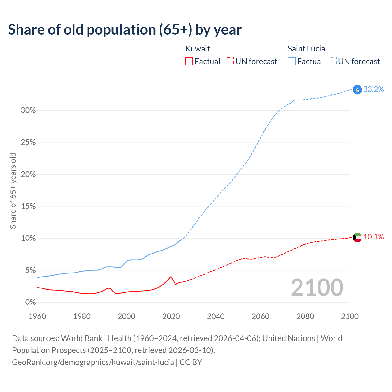 The share of older people aged 65 and over is 3.1% in Kuwait and 9.62% in Saint Lucia. Life expectancy in Kuwait compared to Saint Lucia .