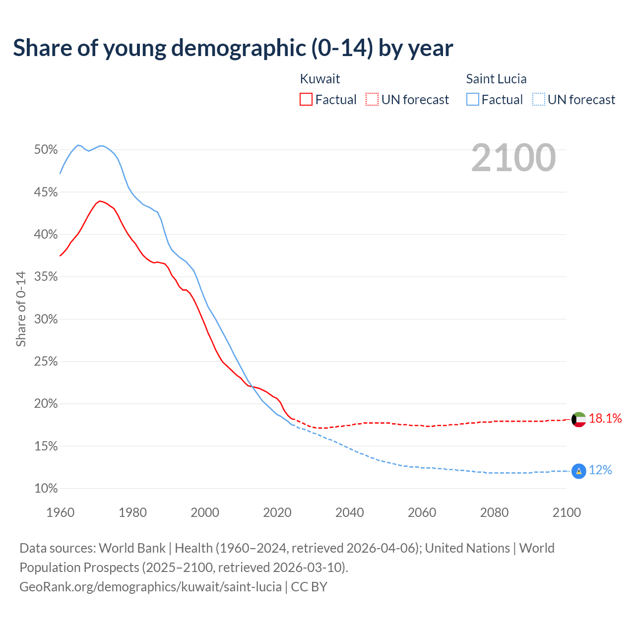 - The share of young demographic (0-15 years old) in Kuwait is 18.2% vs 17.5% in Saint Lucia.