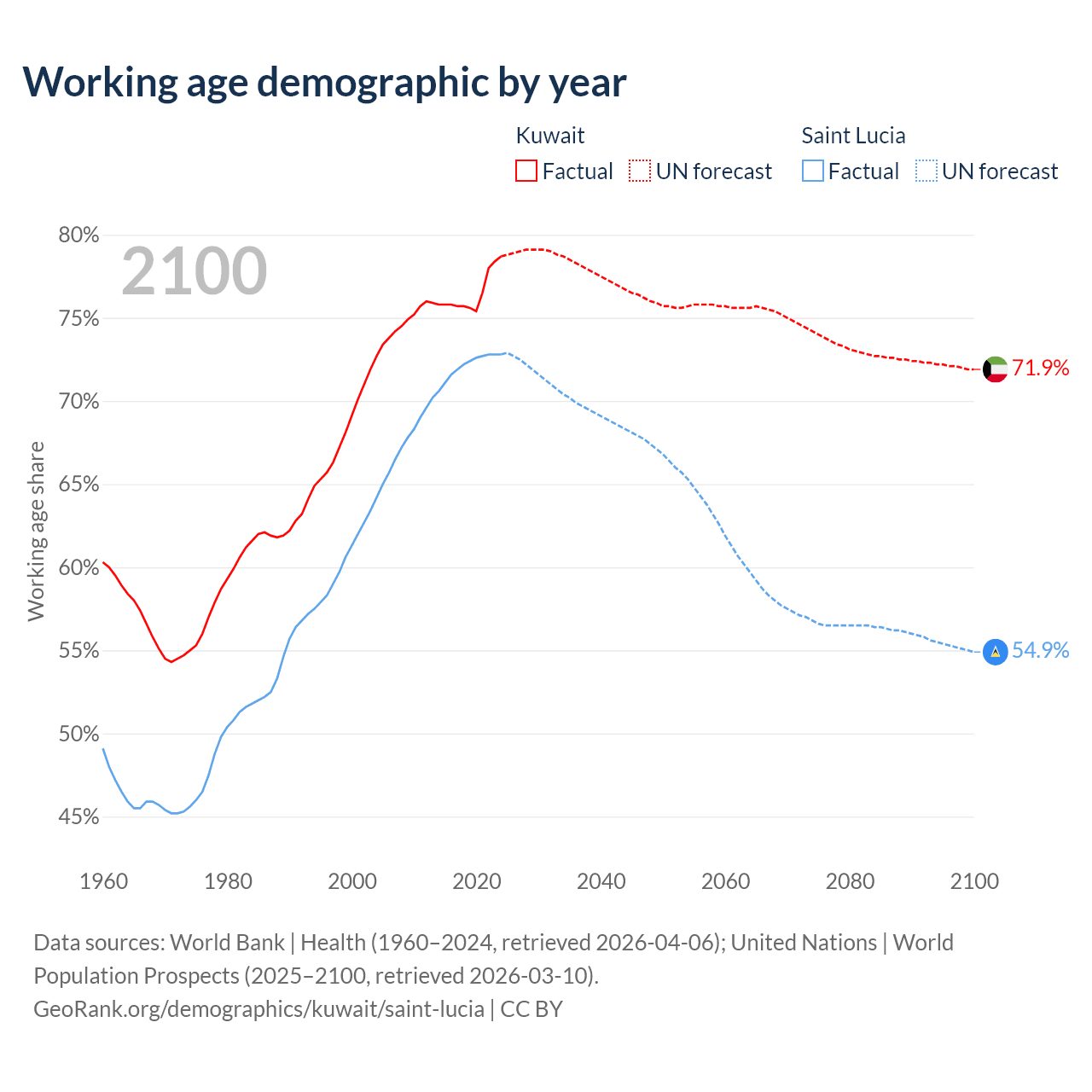 - Kuwait has 4.01M working age adults (aged 15-64) vs 132K in Saint Lucia.