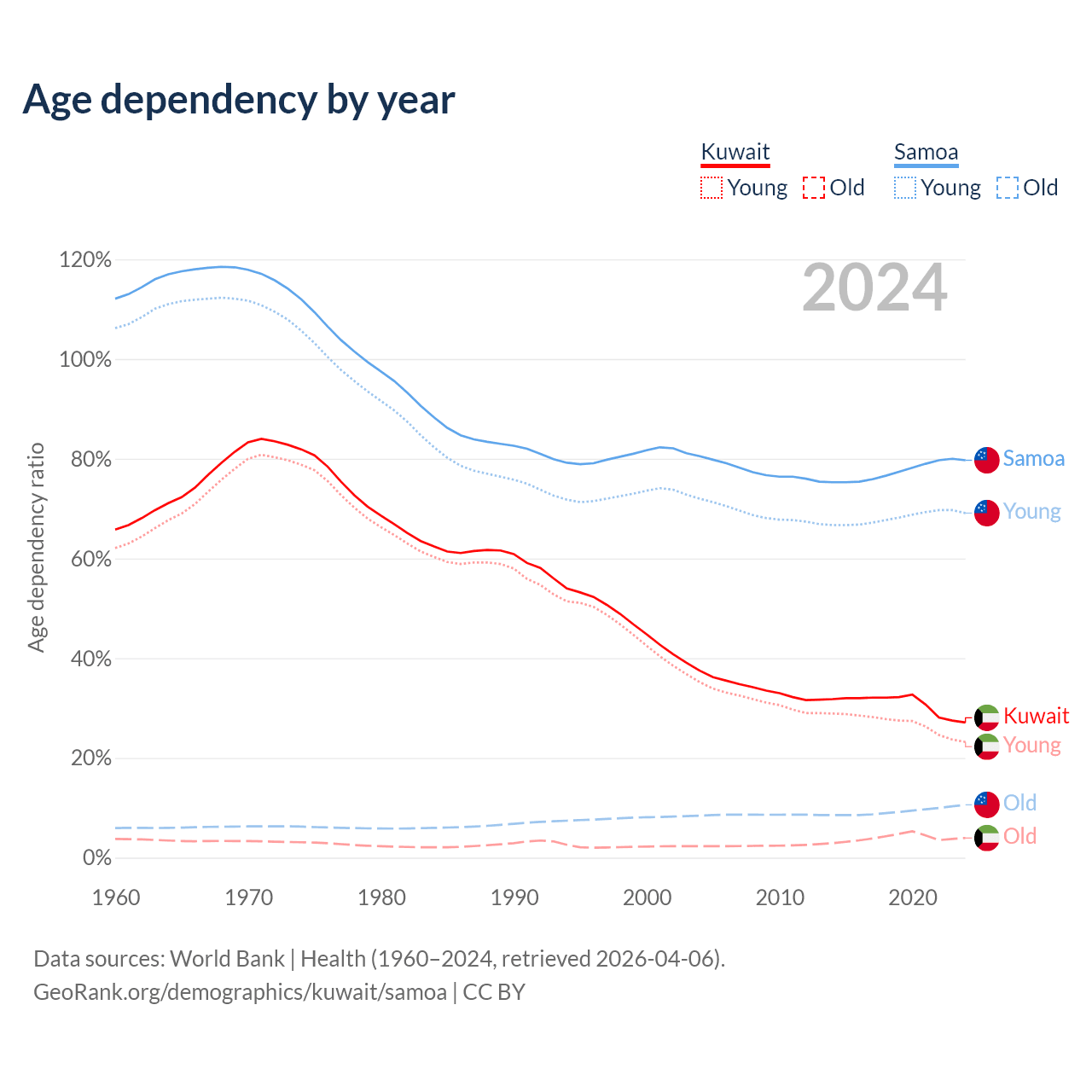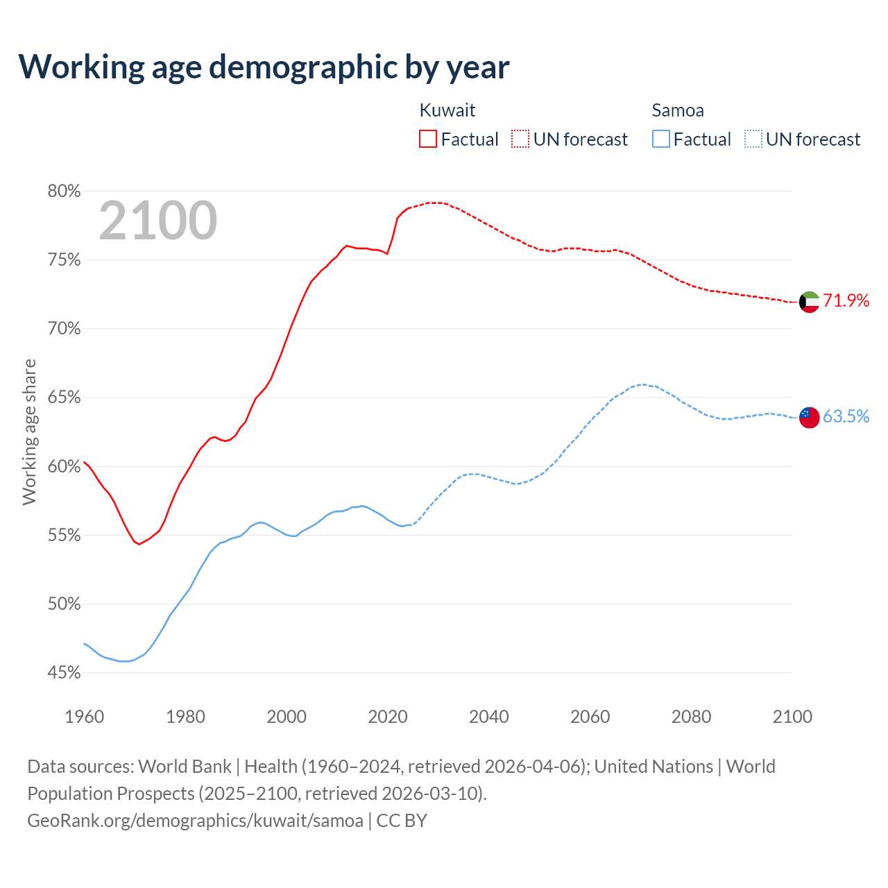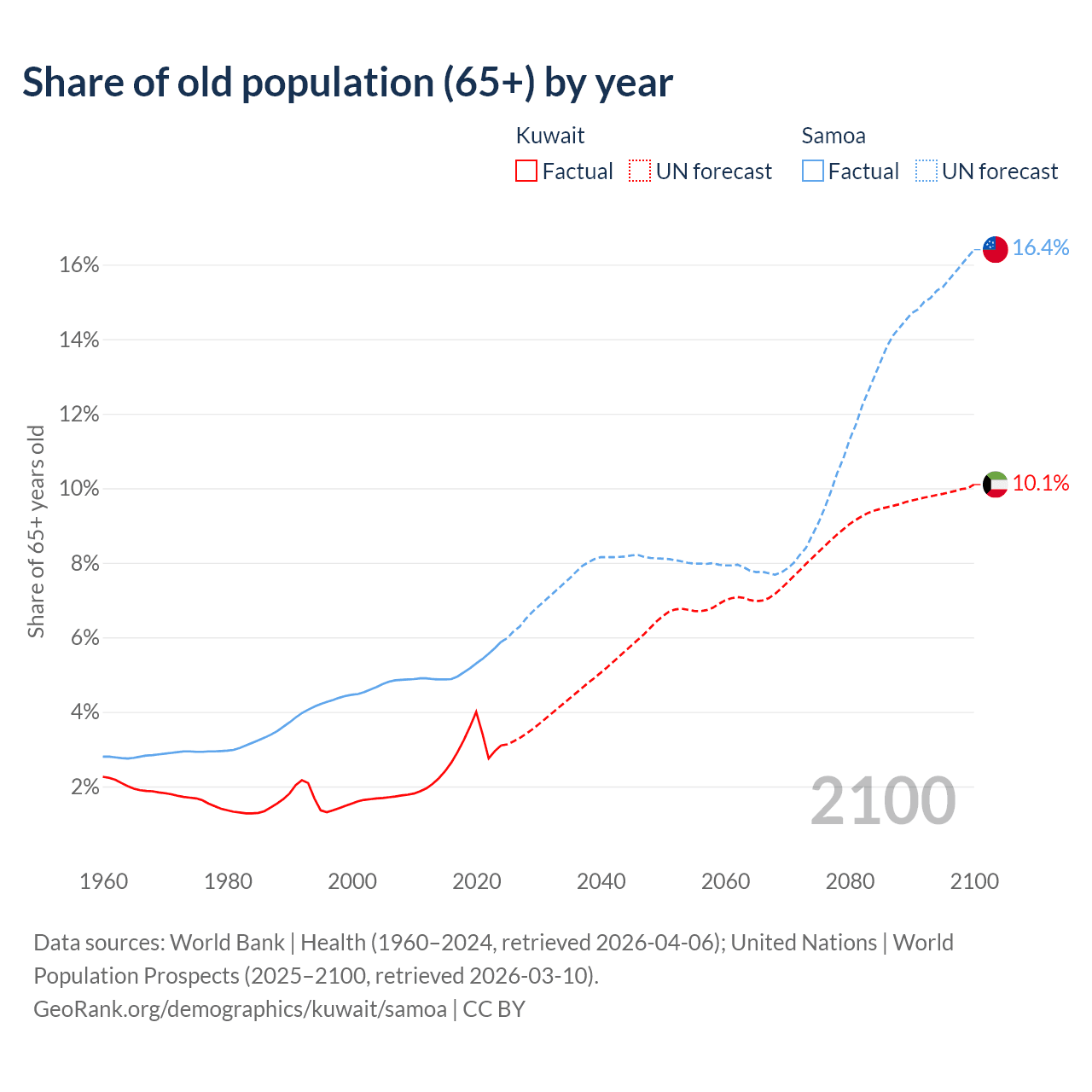 The share of older people aged 65 and over is 3.1% in Kuwait and 5.88% in Samoa. Life expectancy in Kuwait compared to Samoa .