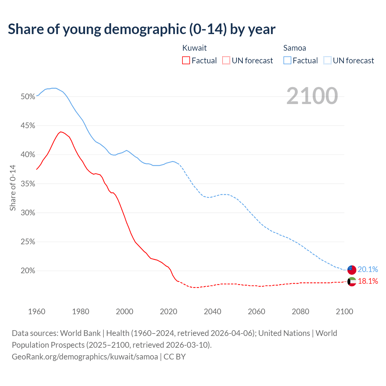 Median age Kuwait vs Samoa, 1960-2100