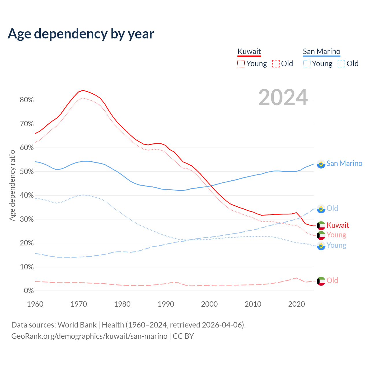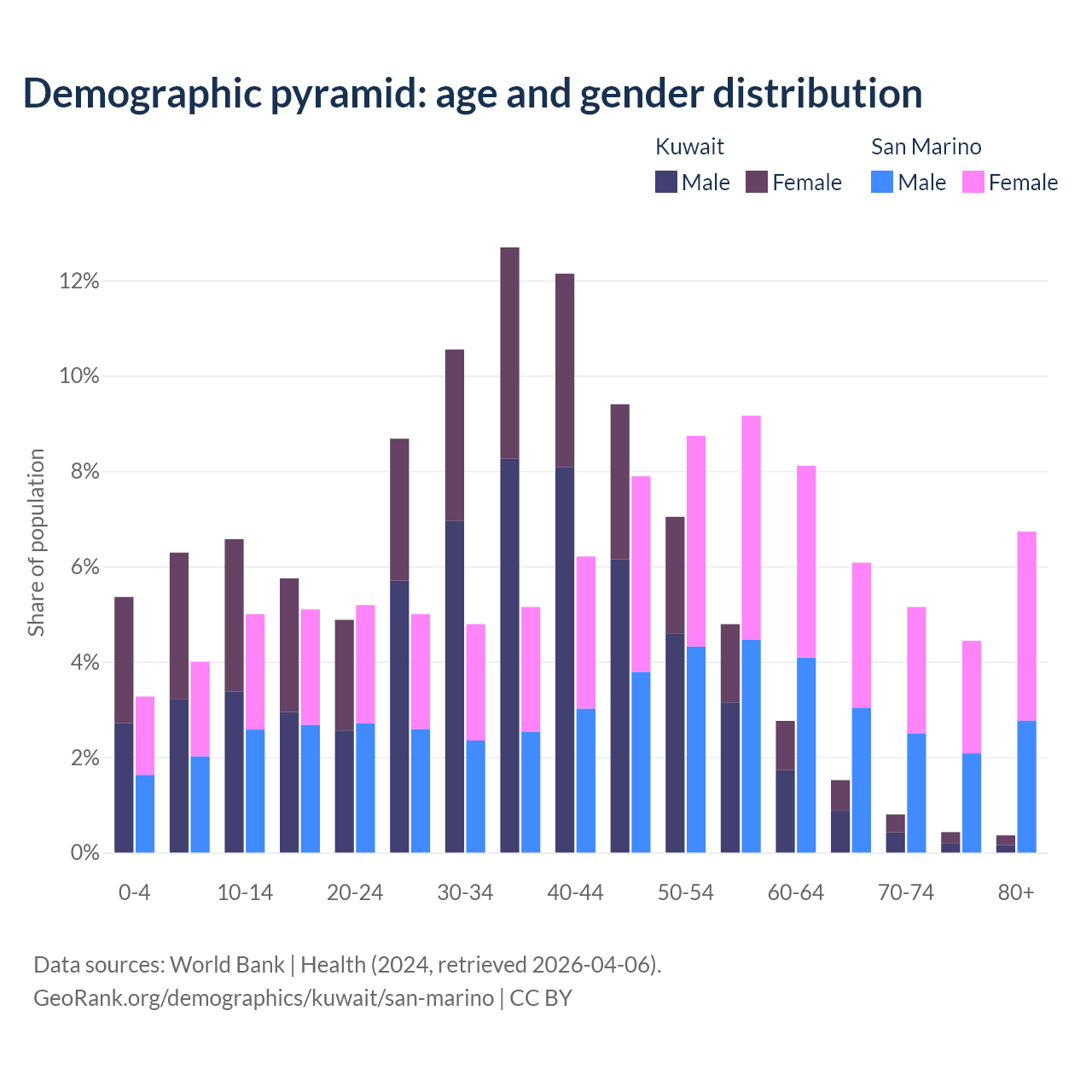 - Kuwait is ranked 71/196 by median age (oldest to youngest) vs 3/196 for San Marino.