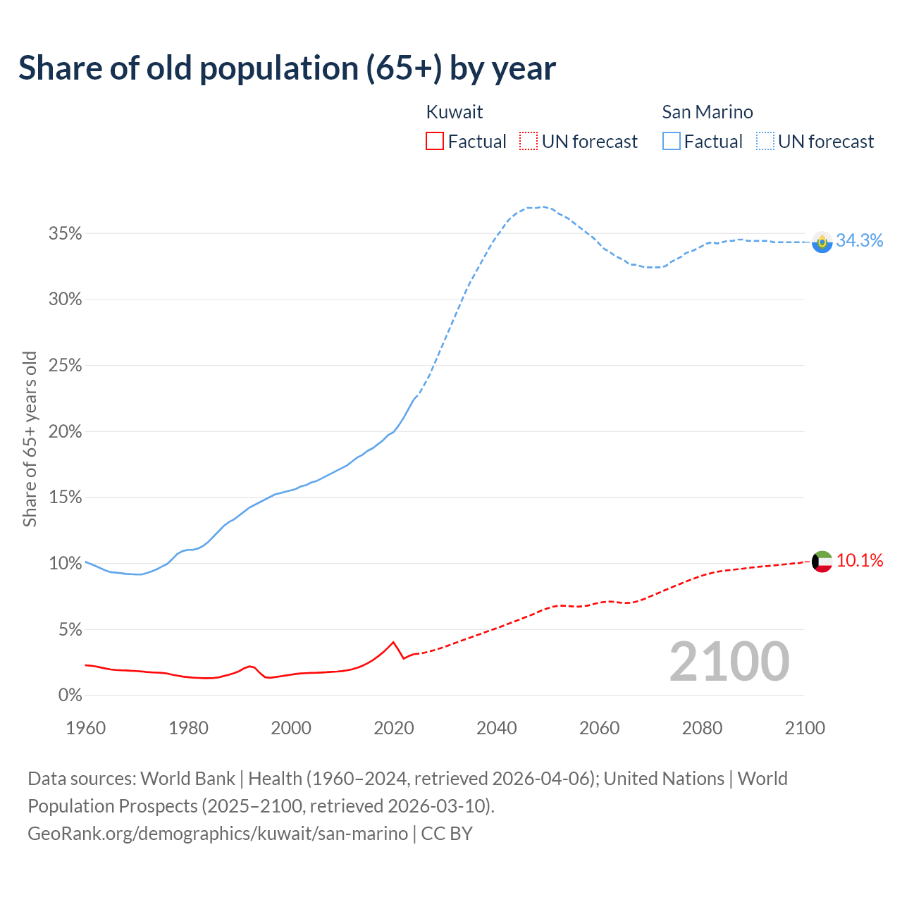 The share of older people aged 65 and over is 3.1% in Kuwait and 22.4% in San Marino. Life expectancy in Kuwait compared to San Marino .