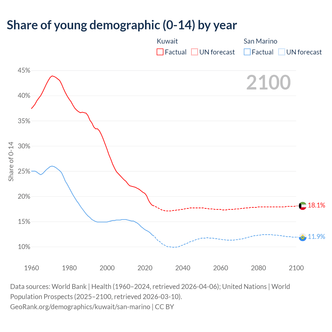- The share of young demographic (0-15 years old) in Kuwait is 18.2% vs 12.3% in San Marino.