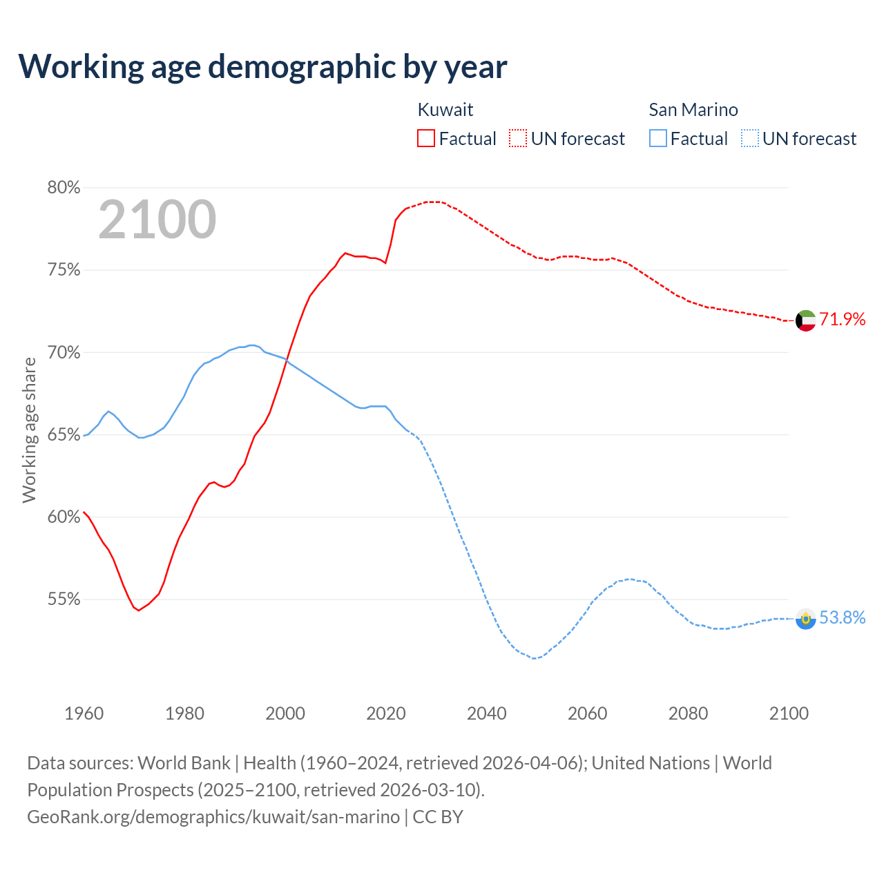 - Kuwait has 4.01M working age adults (aged 15-64) vs 22.2K in San Marino.
