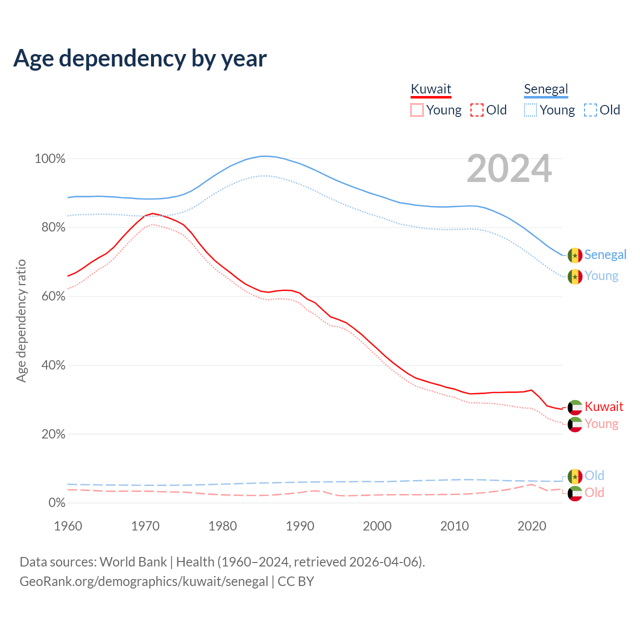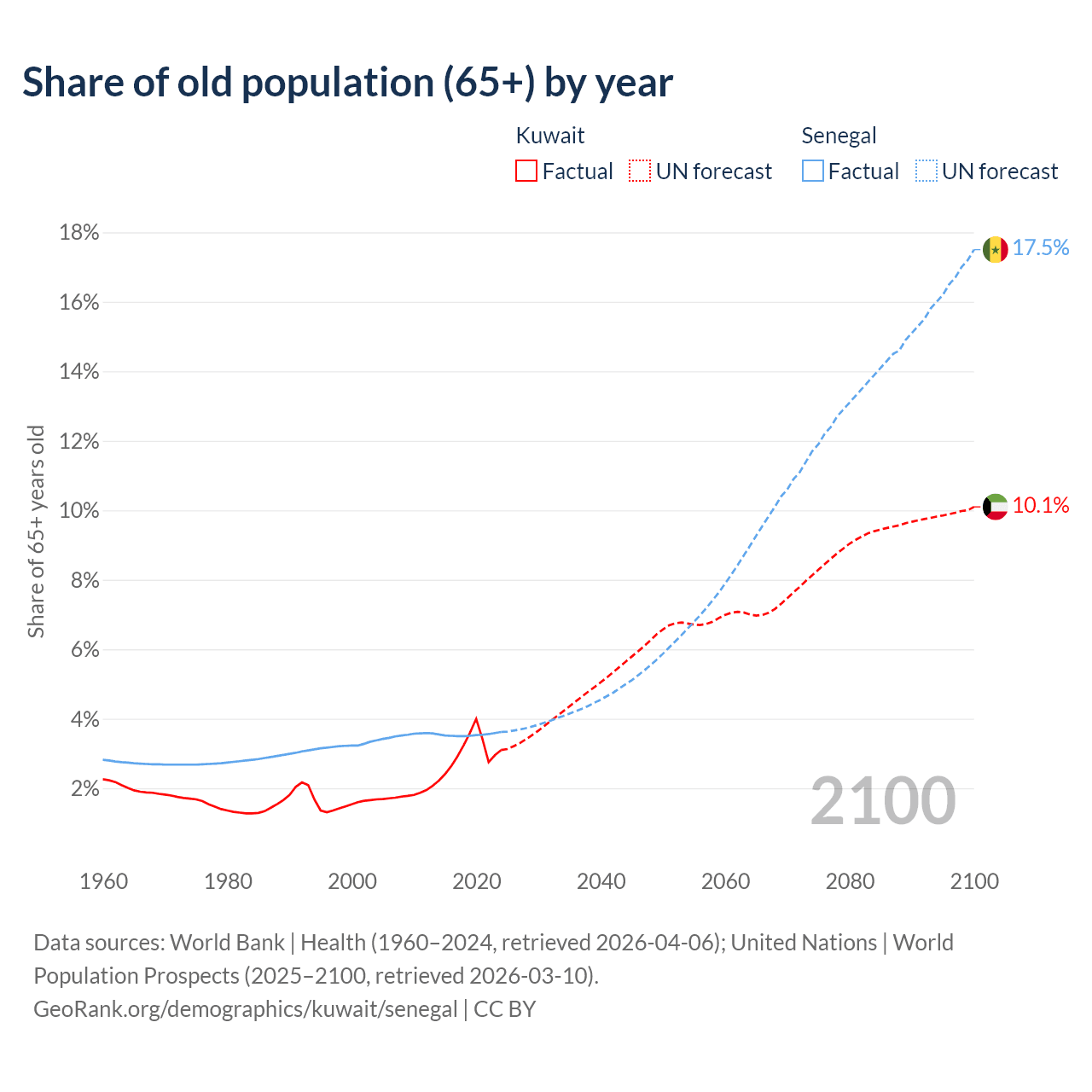 The share of older people aged 65 and over is 3.1% in Kuwait and 3.62% in Senegal. Life expectancy in Kuwait compared to Senegal .