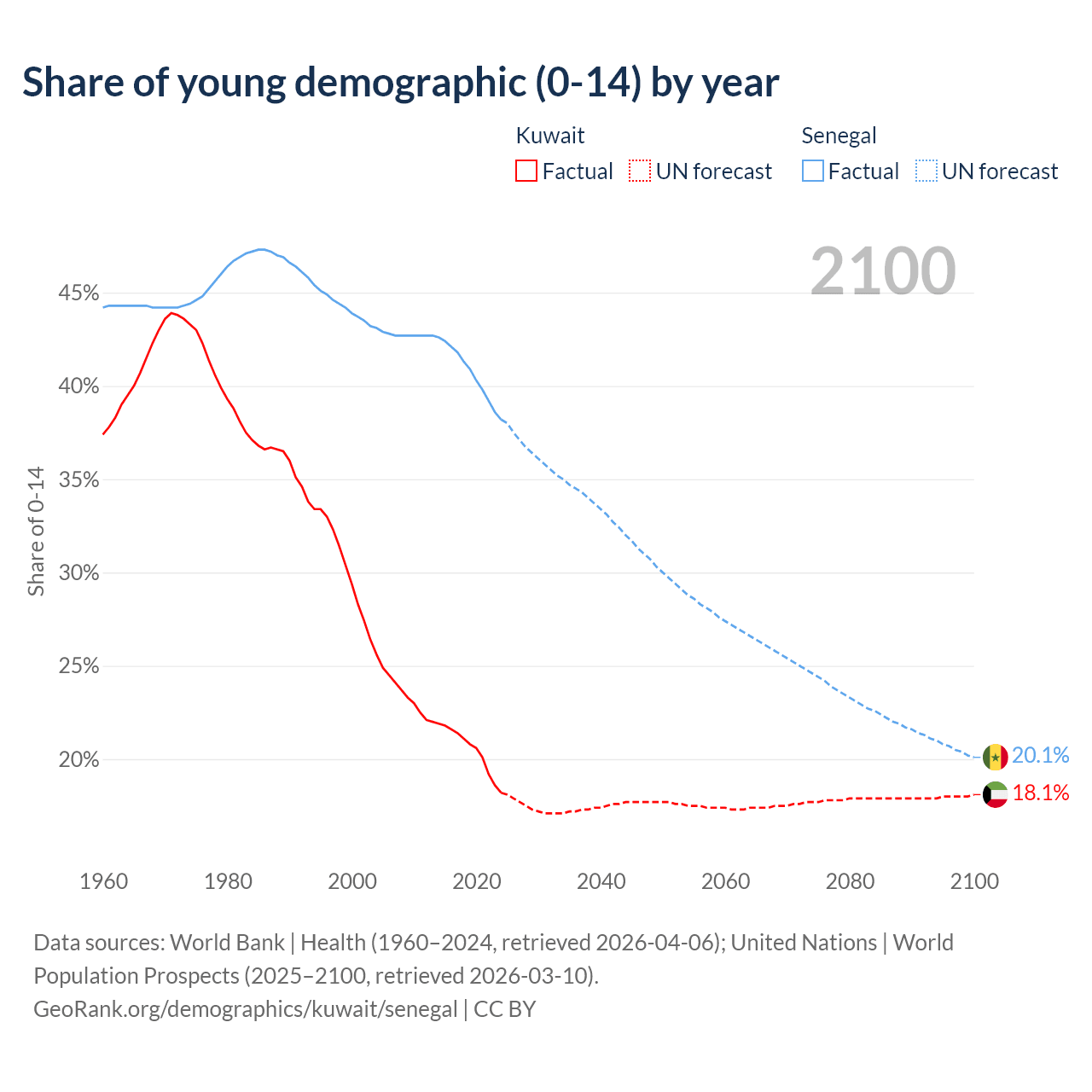 Median age Kuwait vs Senegal, 1960-2100