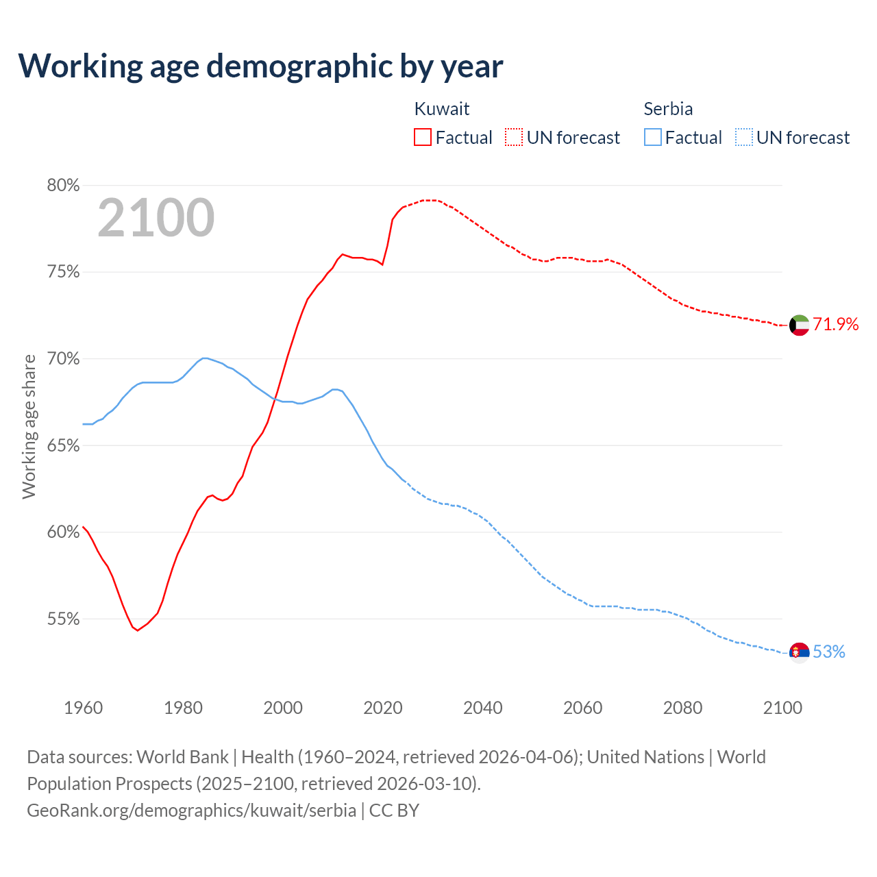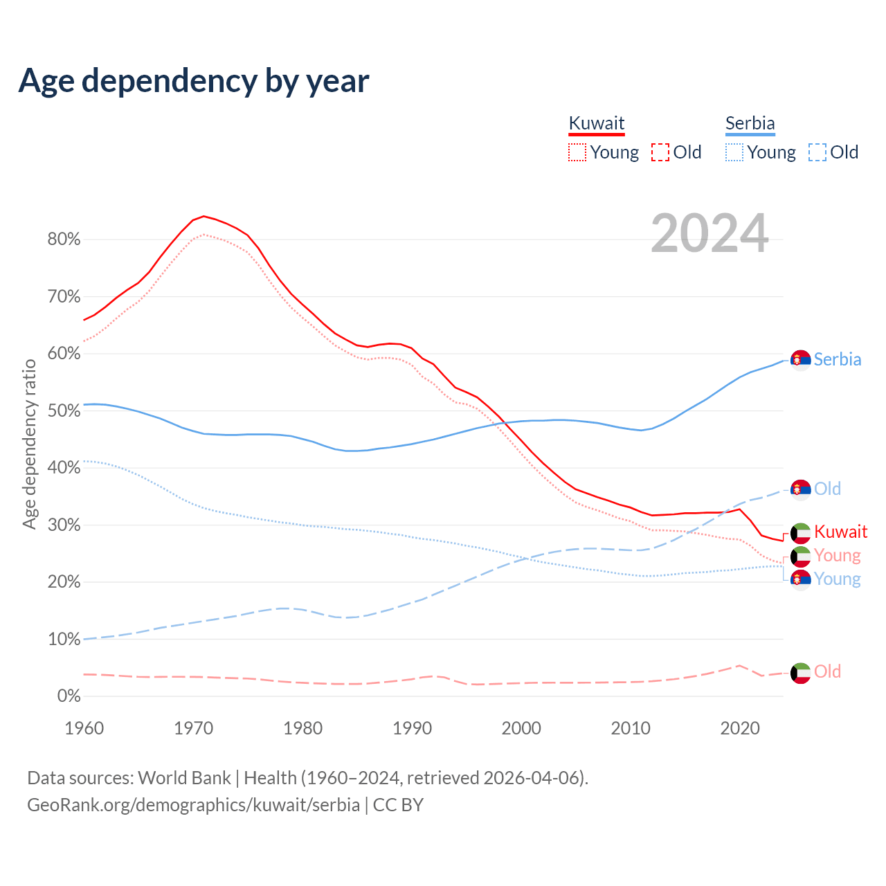 The share of older people aged 65 and over is 3.1% in Kuwait and 22.7% in Serbia. Life expectancy in Kuwait compared to Serbia .