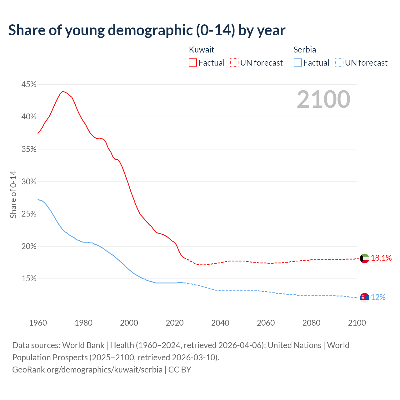 - The share of young demographic (0-15 years old) in Kuwait is 18.2% vs 14.3% in Serbia.