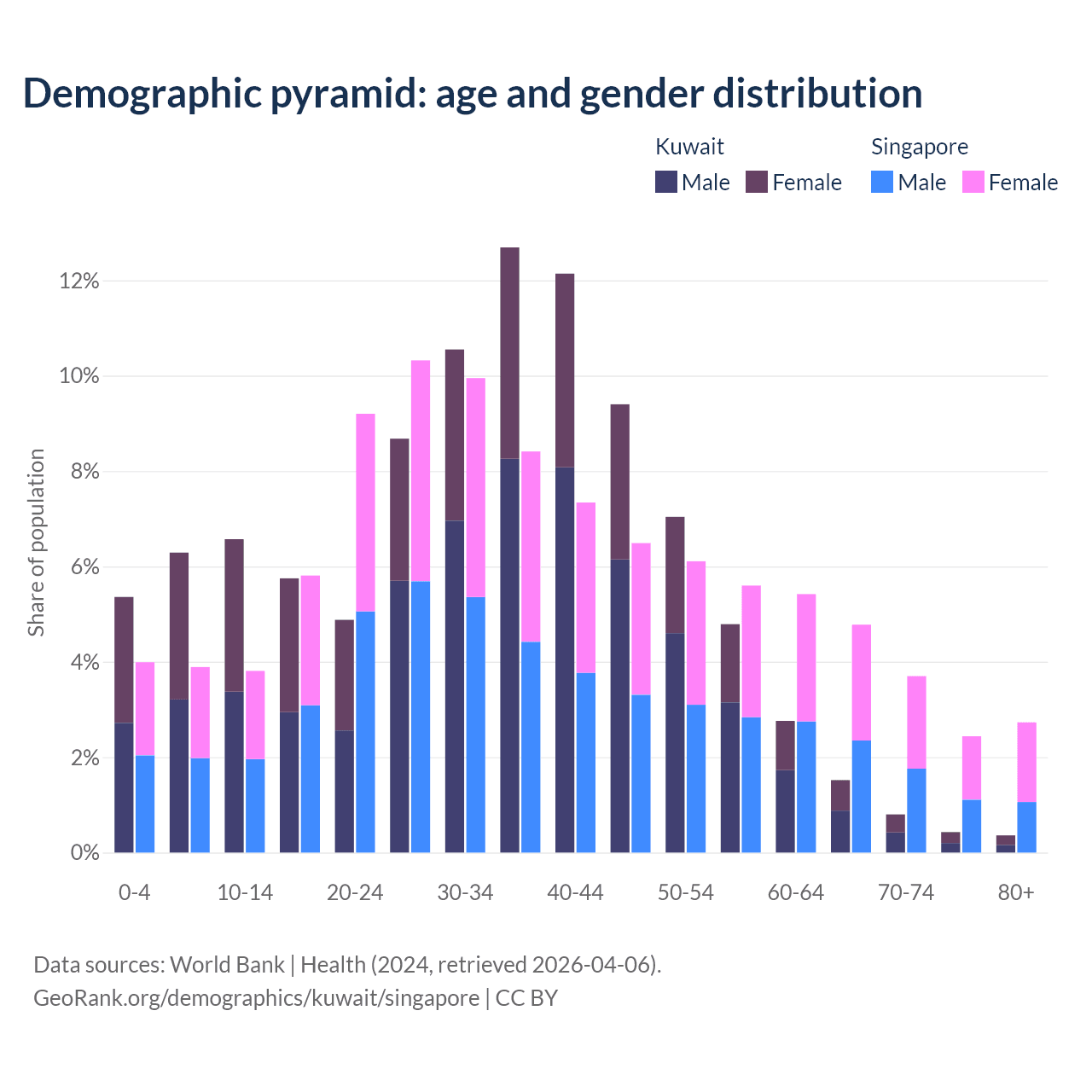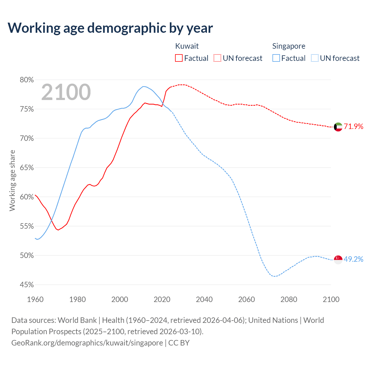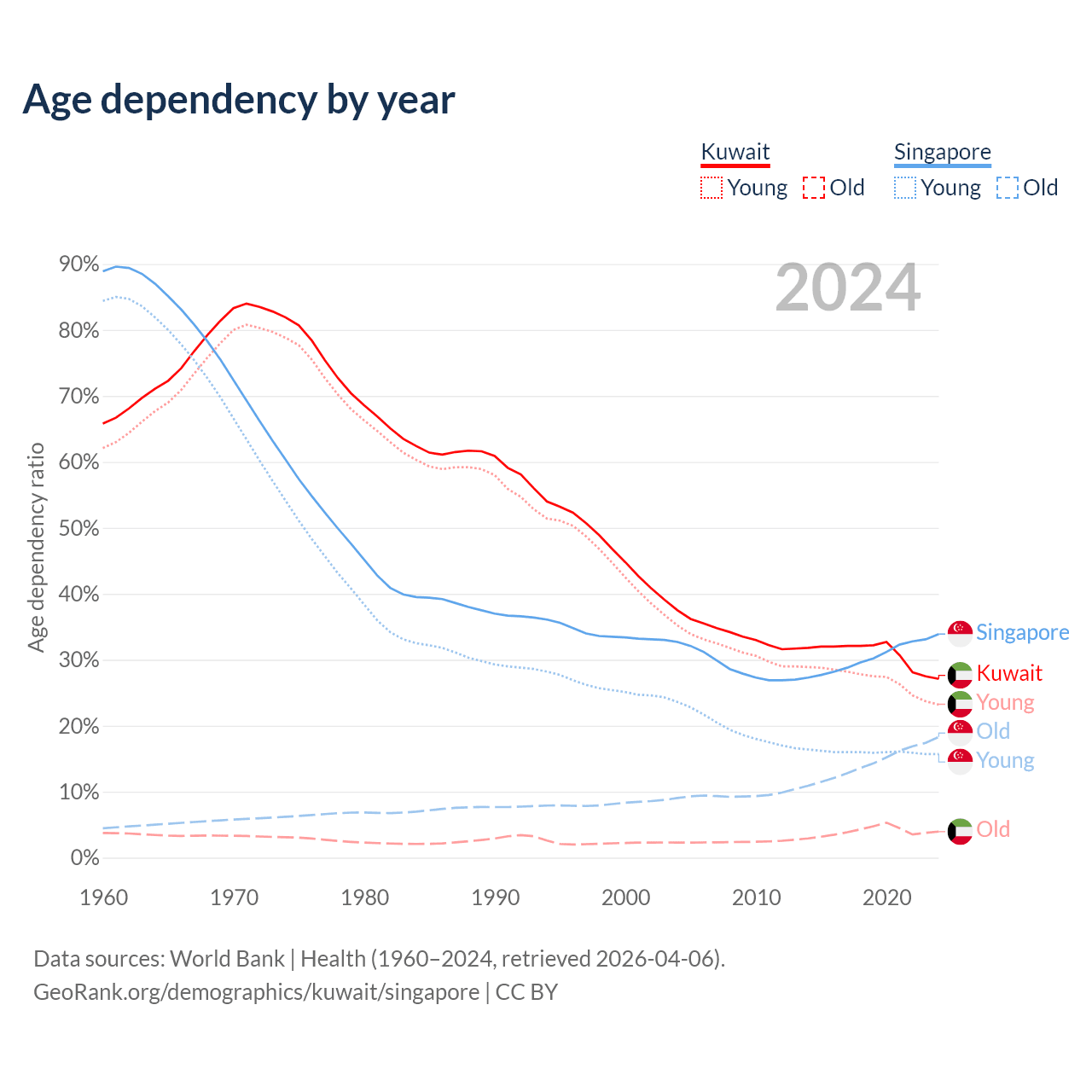 The share of older people aged 65 and over is 3.1% in Kuwait and 13.7% in Singapore. Life expectancy in Kuwait compared to Singapore .