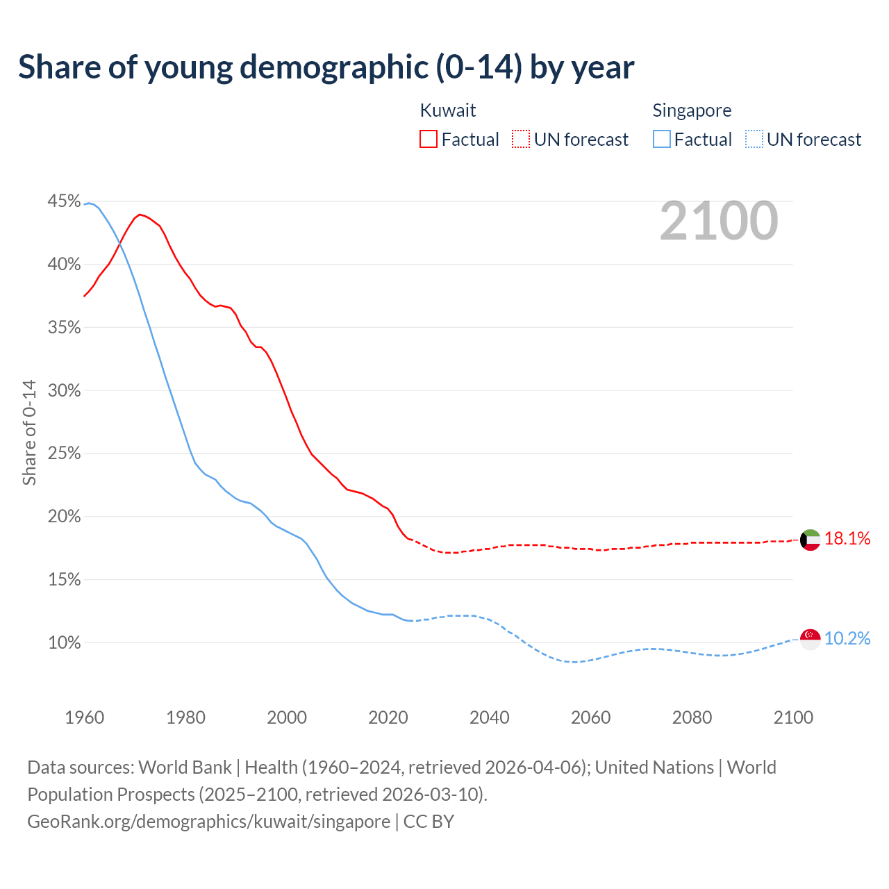 - The share of young demographic (0-15 years old) in Kuwait is 18.2% vs 11.7% in Singapore.