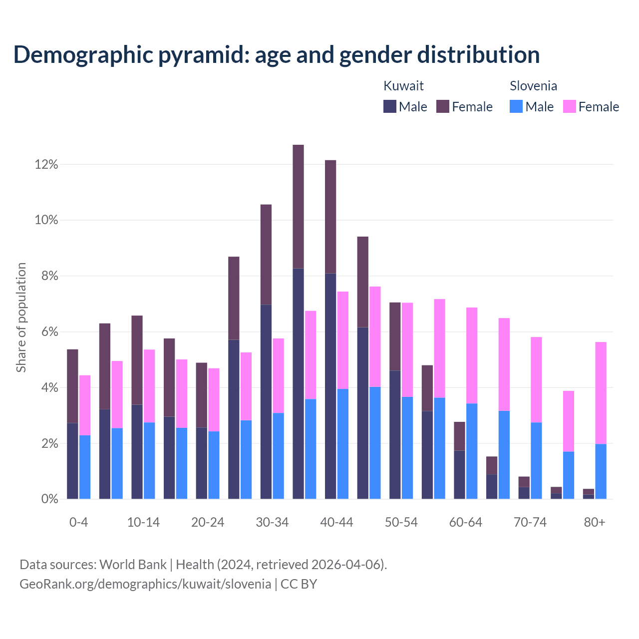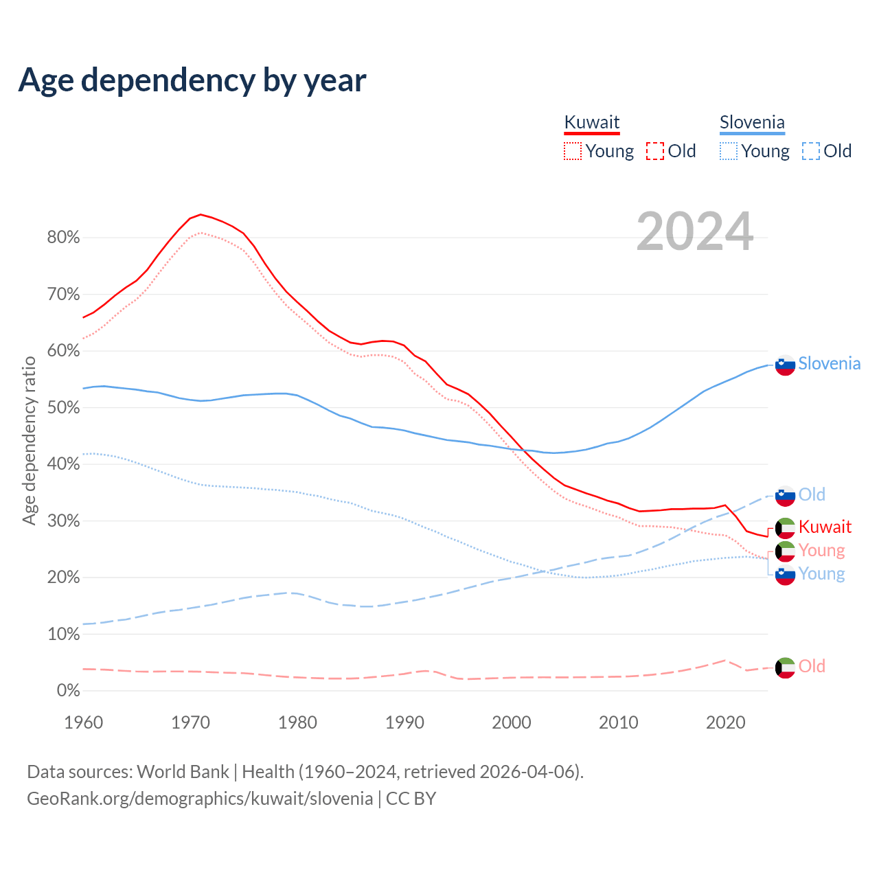 - Kuwait is ranked 71/196 by median age (oldest to youngest) vs 14/196 for Slovenia.