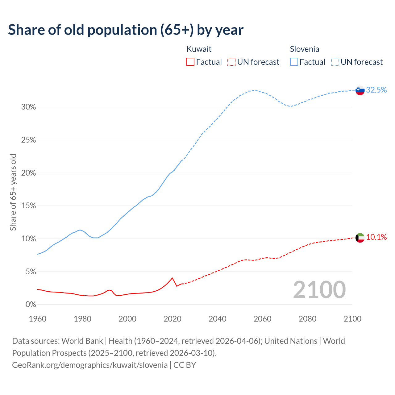 The share of older people aged 65 and over is 3.1% in Kuwait and 21.8% in Slovenia. Life expectancy in Kuwait compared to Slovenia .