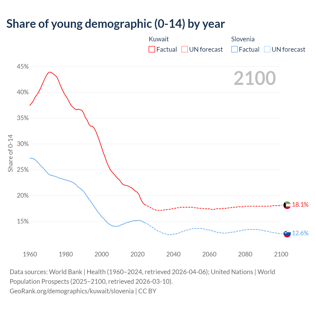 - The share of young demographic (0-15 years old) in Kuwait is 18.2% vs 14.7% in Slovenia.