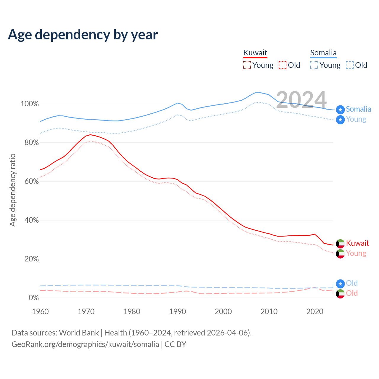 - The share of old-age demographic (65+) in Kuwait is 3.1% vs 2.59% in Somalia.