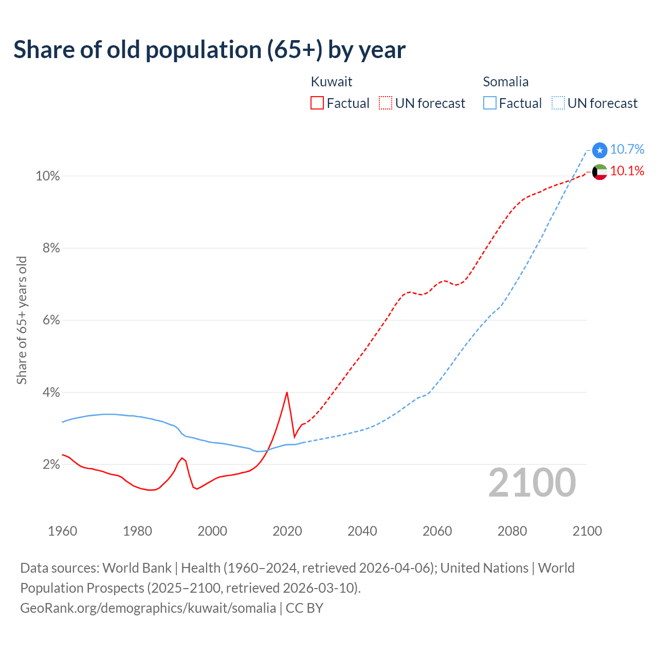 The share of older people aged 65 and over is 3.1% in Kuwait and 2.59% in Somalia. Life expectancy in Kuwait compared to Somalia .