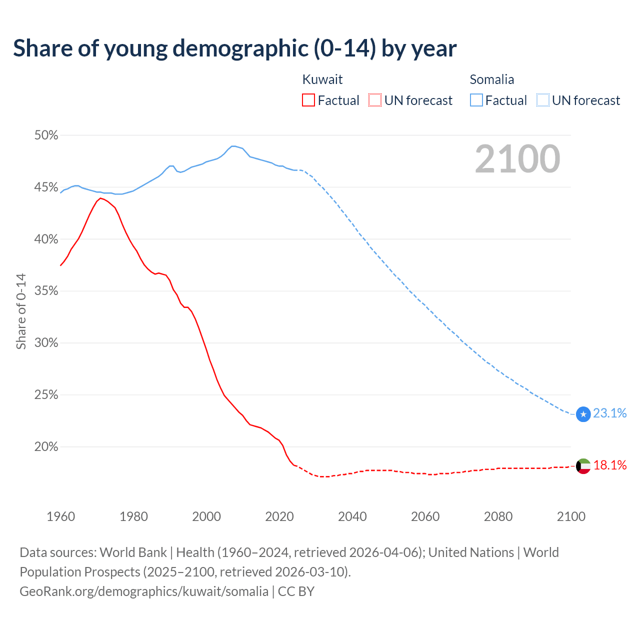 Median age Kuwait vs Somalia, 1960-2100