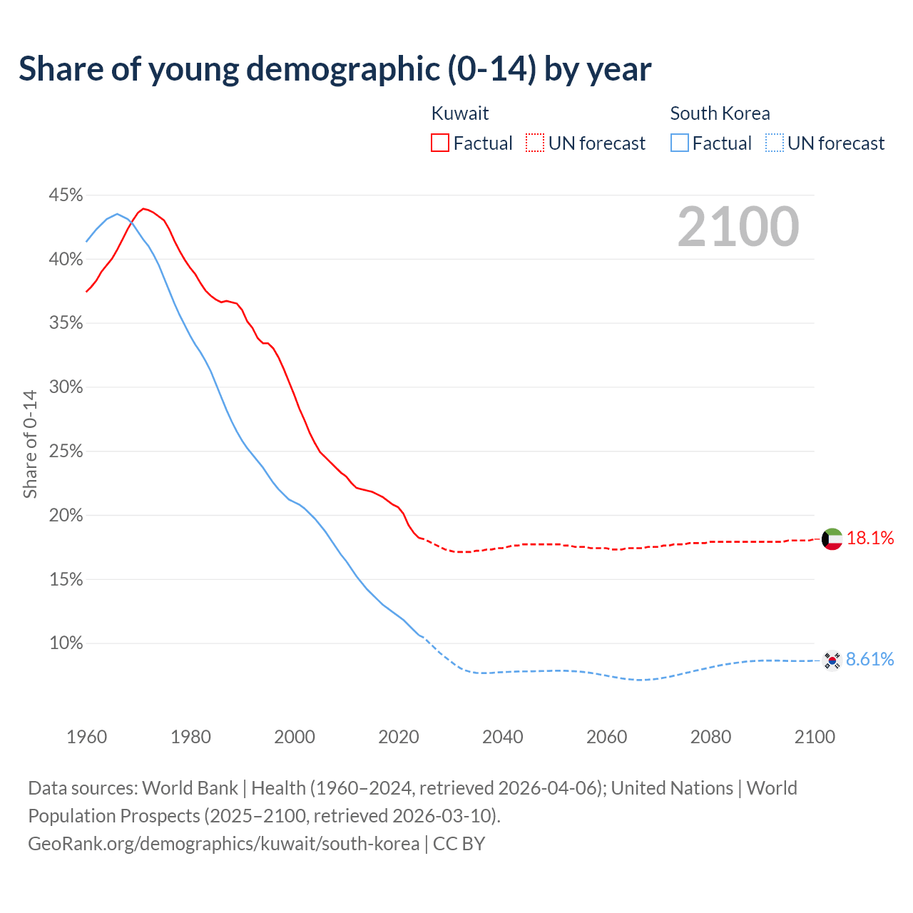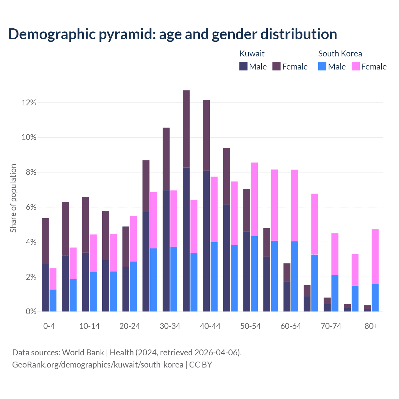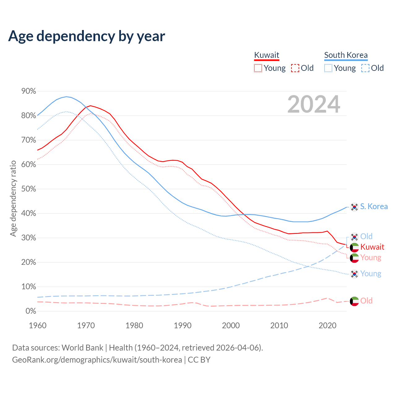 - Kuwait is ranked 71/196 by median age (oldest to youngest) vs 10/196 for South Korea.