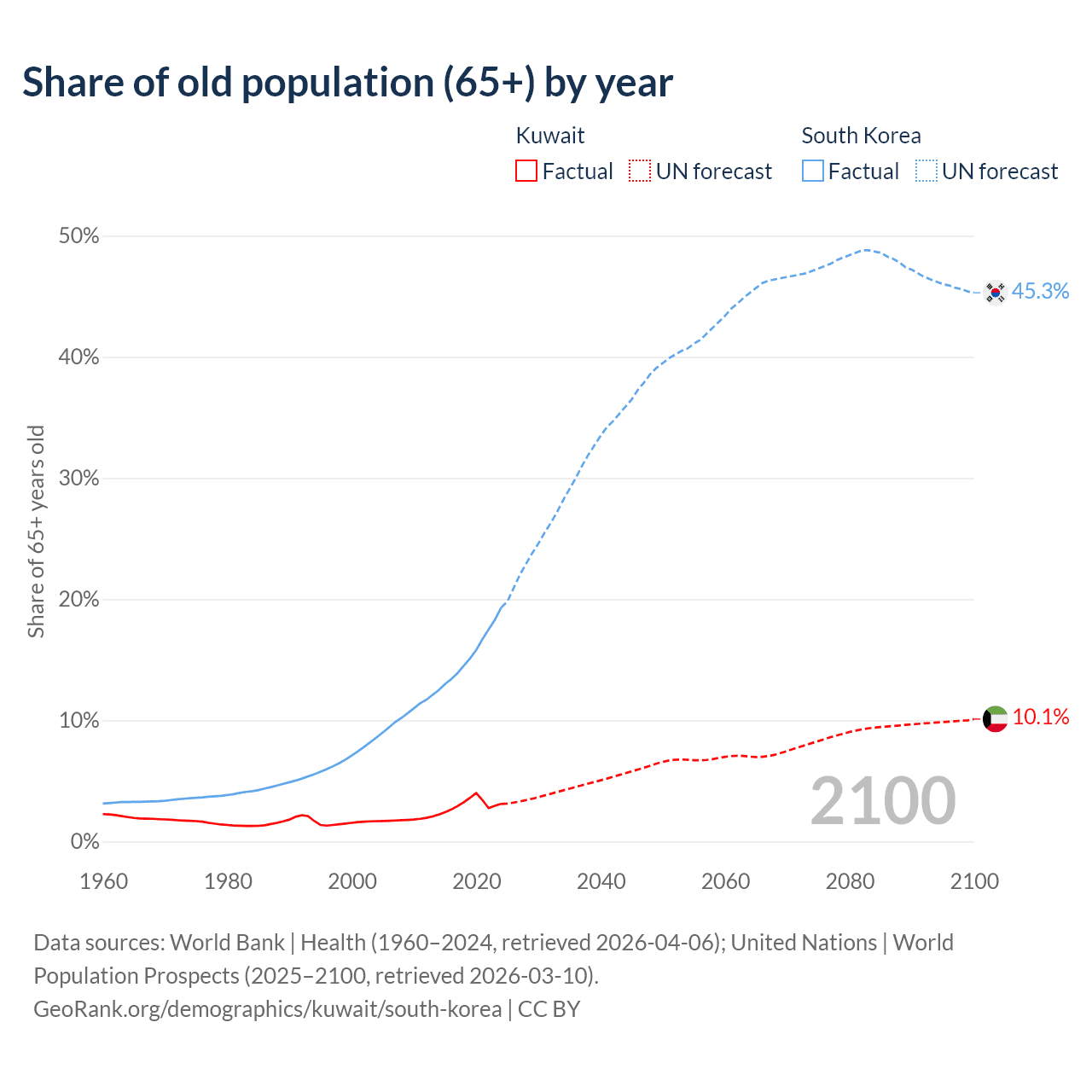The share of older people aged 65 and over is 3.1% in Kuwait and 19.3% in South Korea. Life expectancy in Kuwait compared to South Korea .