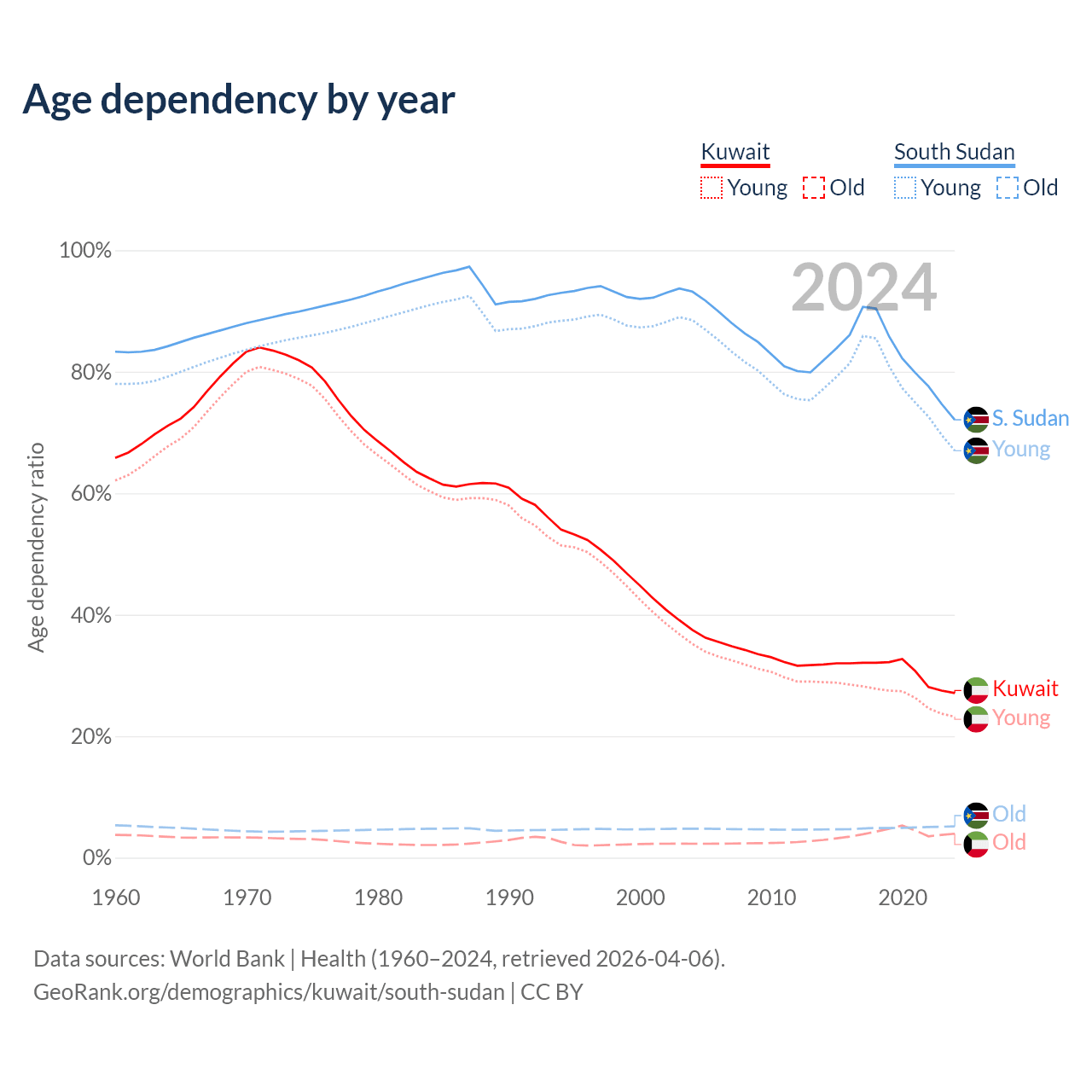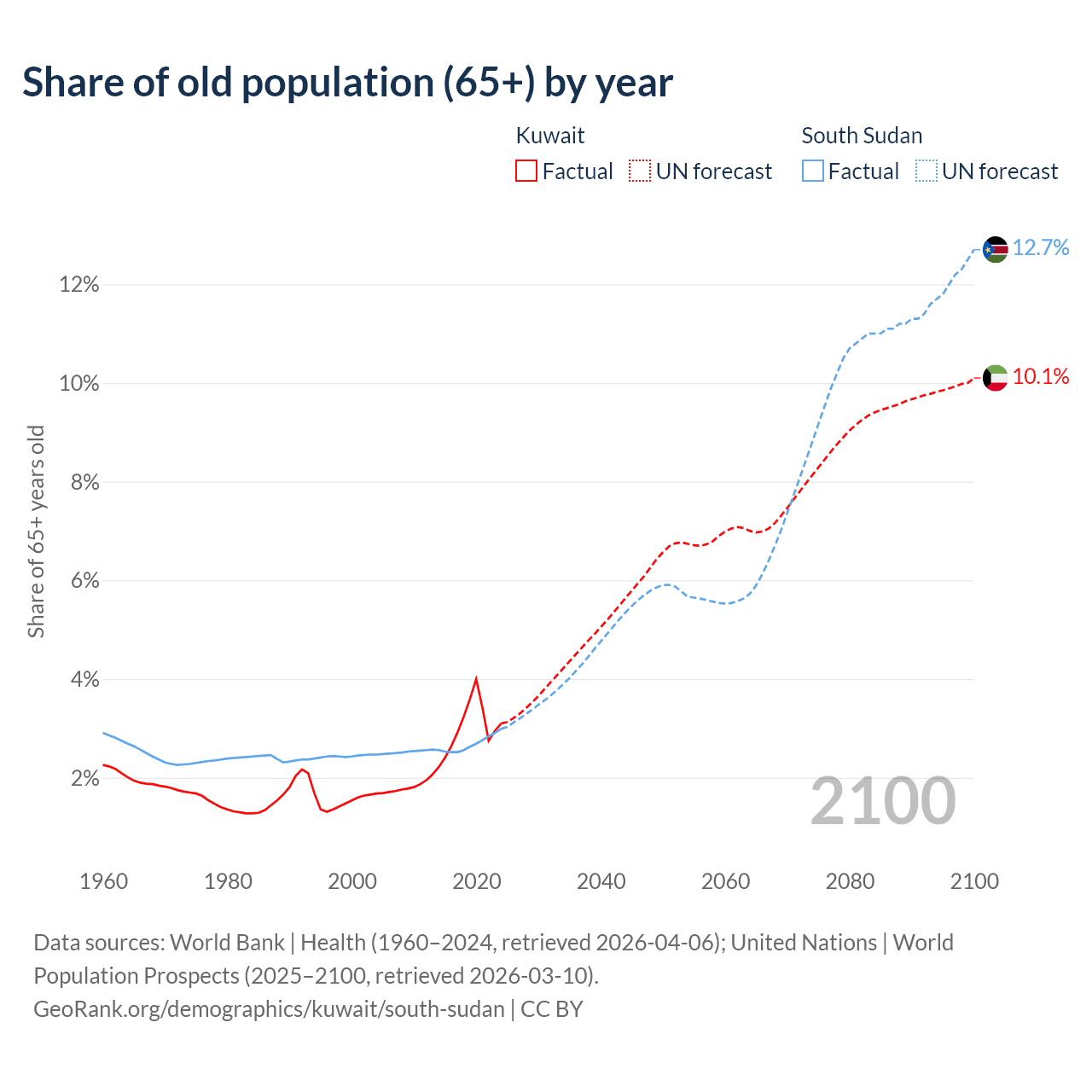 The share of older people aged 65 and over is 3.1% in Kuwait and 2.99% in South Sudan. Life expectancy in Kuwait compared to South Sudan .