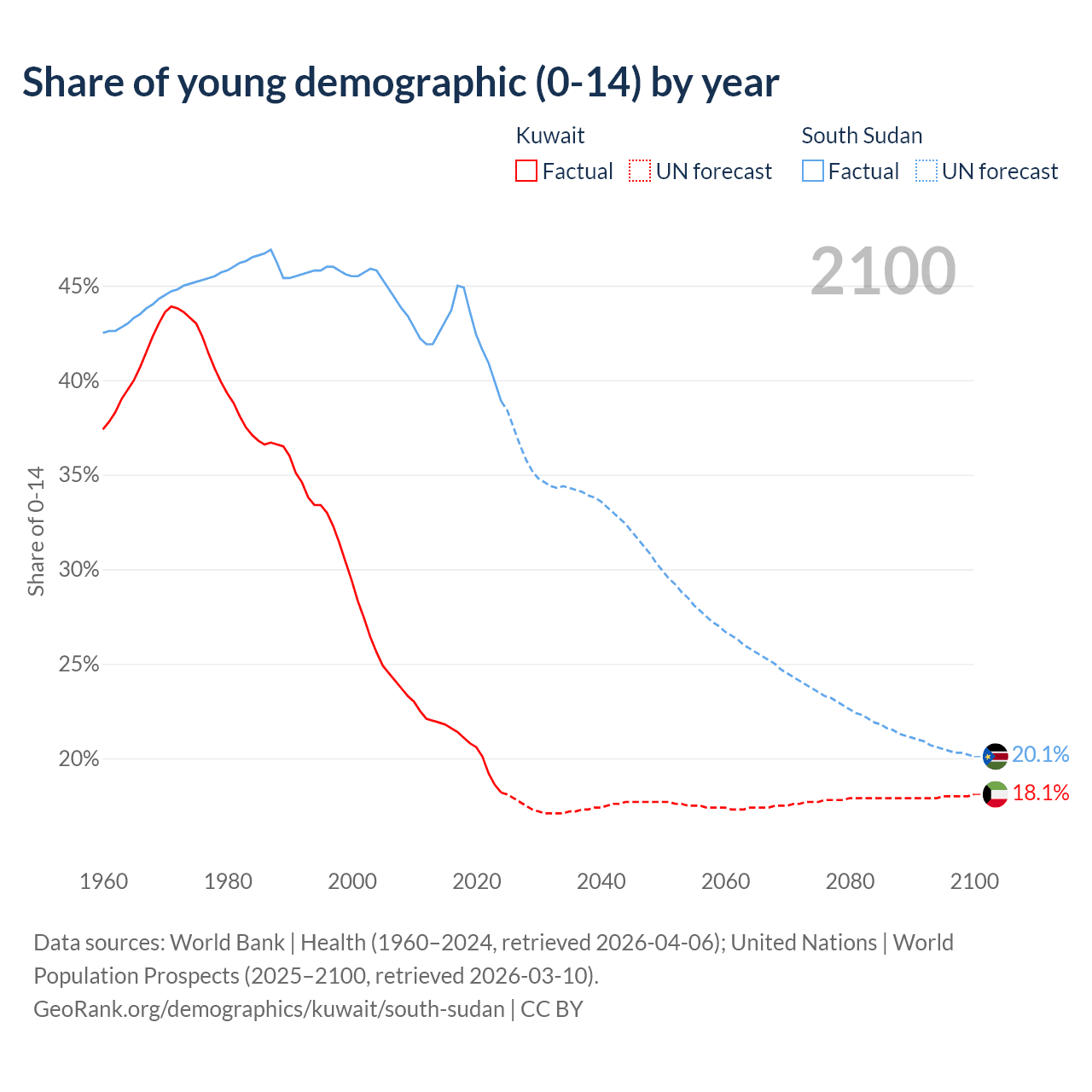 Median age Kuwait vs South Sudan, 1960-2100