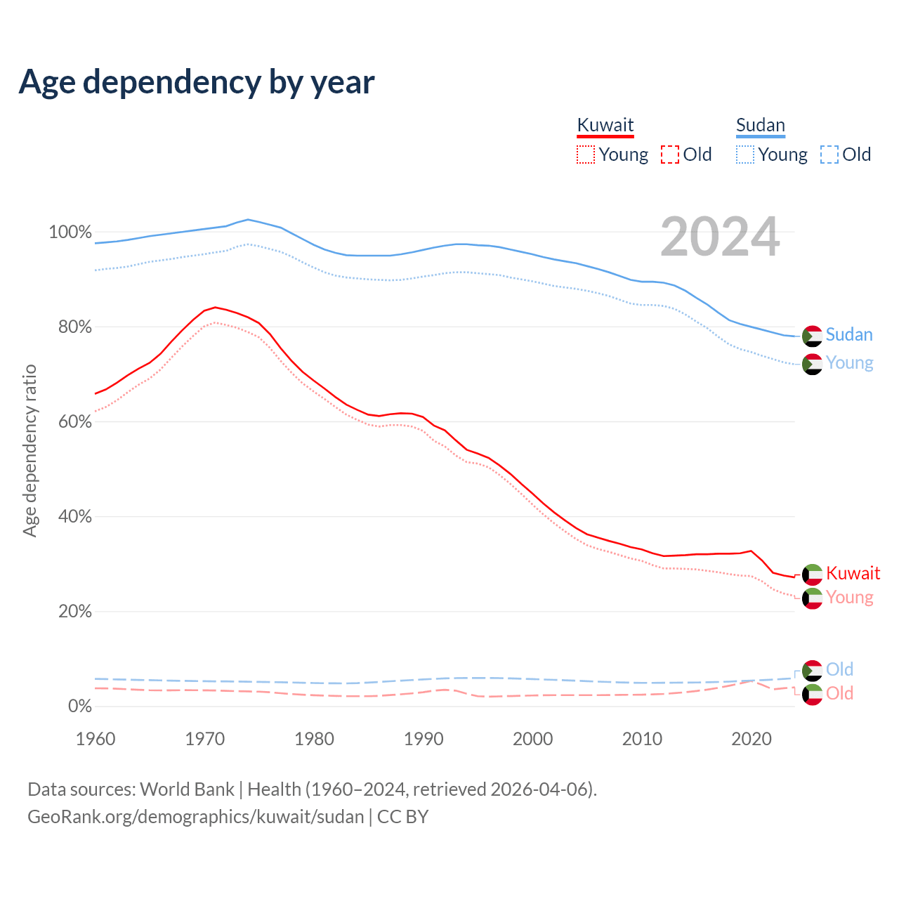 - Kuwait is ranked 71/196 by median age (oldest to youngest) vs 172/196 for Sudan.