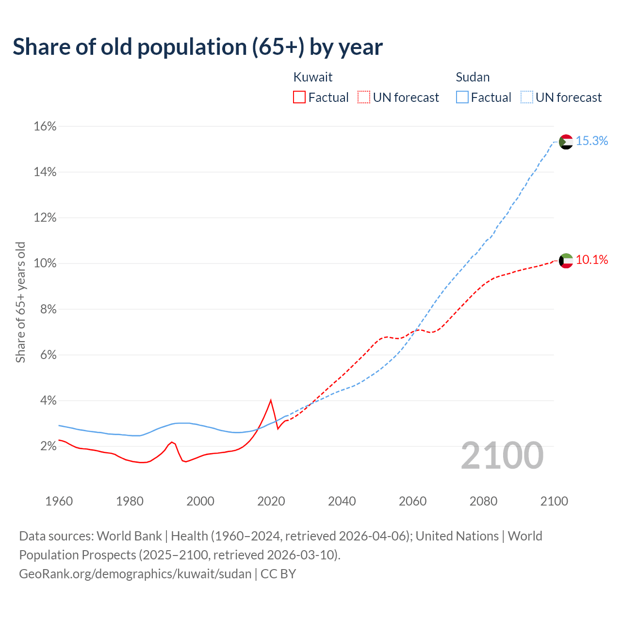 The share of older people aged 65 and over is 3.1% in Kuwait and 3.3% in Sudan. Life expectancy in Kuwait compared to Sudan .