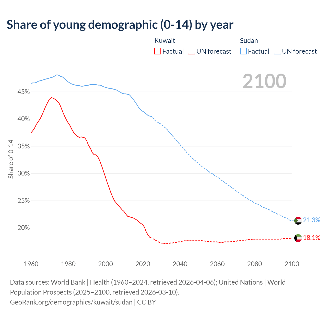 - The share of young demographic (0-15 years old) in Kuwait is 18.2% vs 40.5% in Sudan.