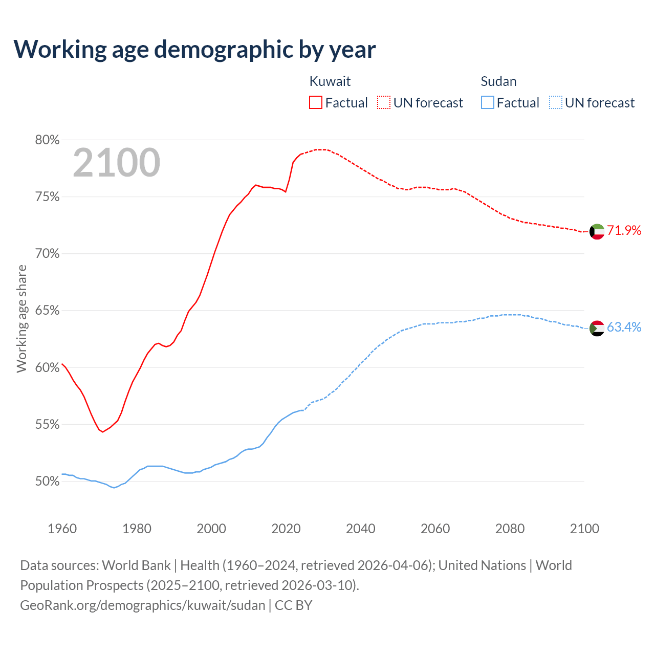 - Kuwait has 4.01M working age adults (aged 15-64) vs 30M in Sudan.