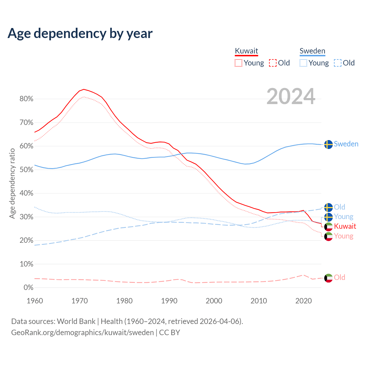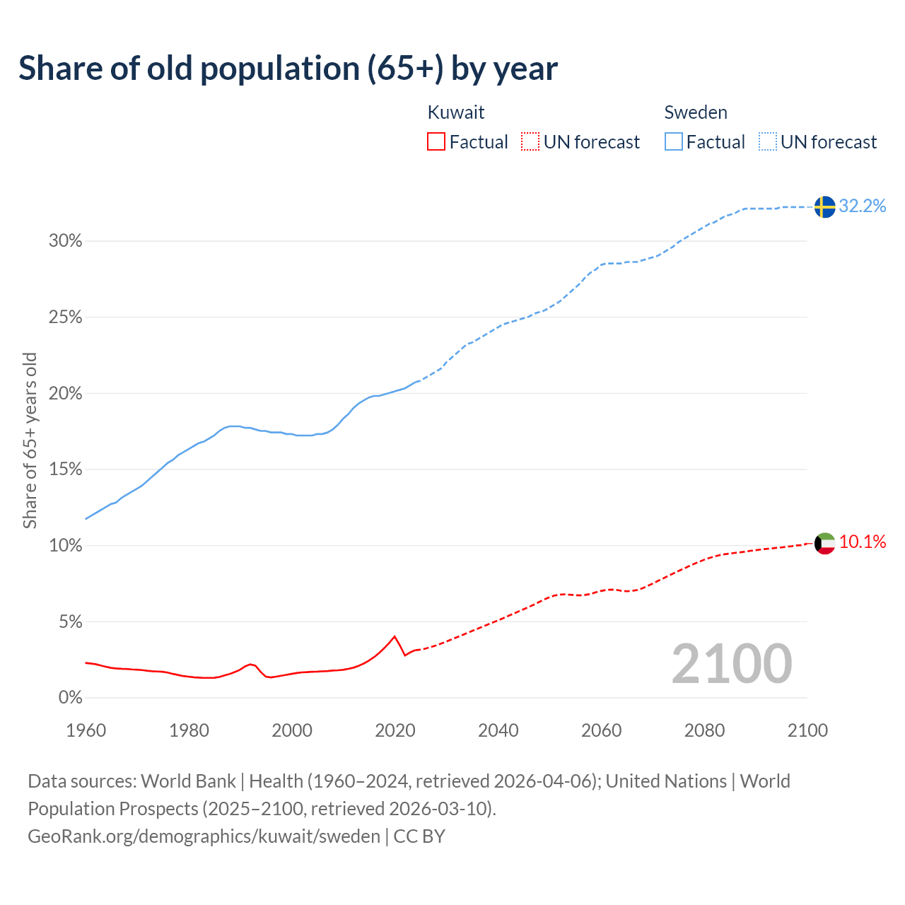 The share of older people aged 65 and over is 3.1% in Kuwait and 20.7% in Sweden. Life expectancy in Kuwait compared to Sweden .
