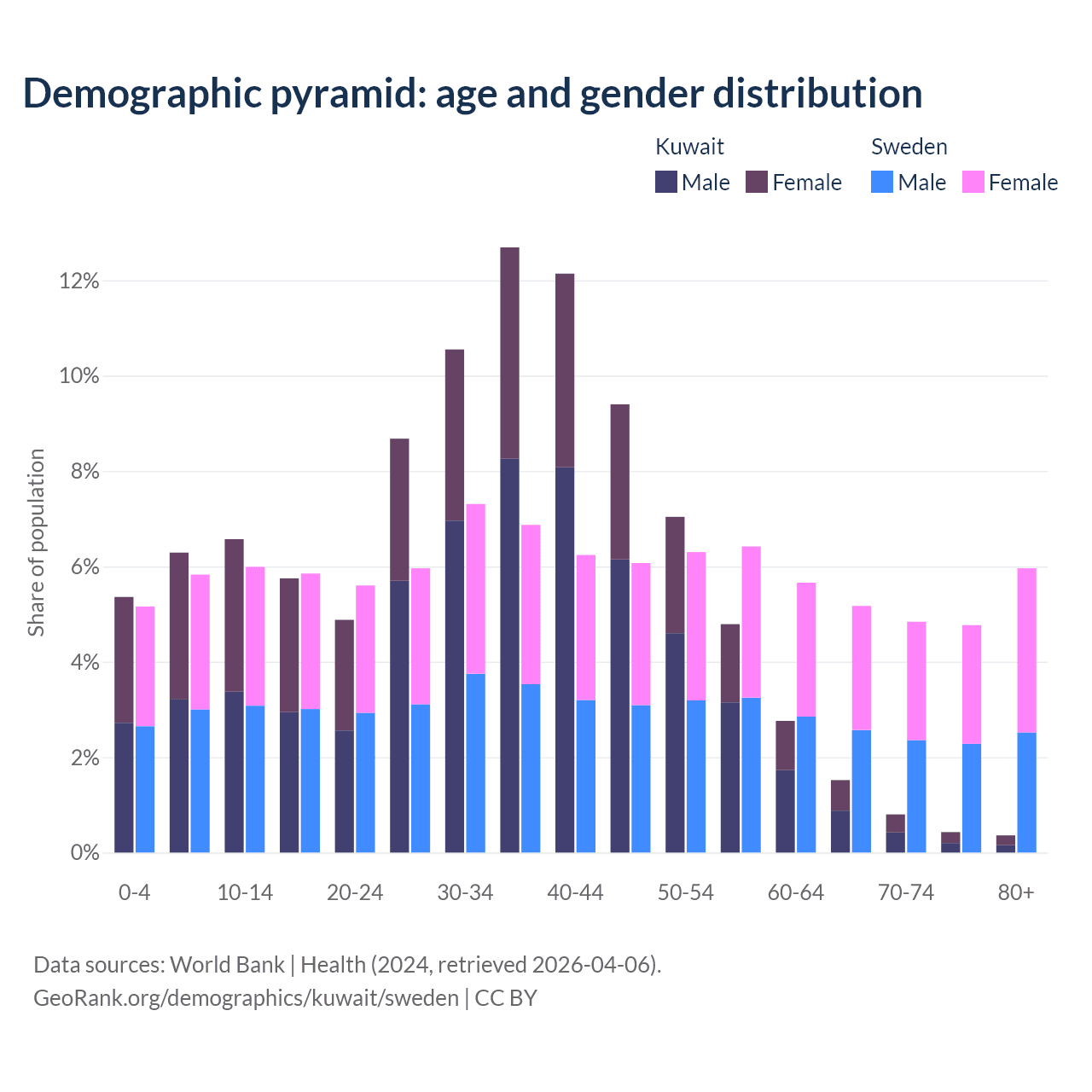 - Kuwait is ranked 71/196 by median age (oldest to youngest) vs 39/196 for Sweden.