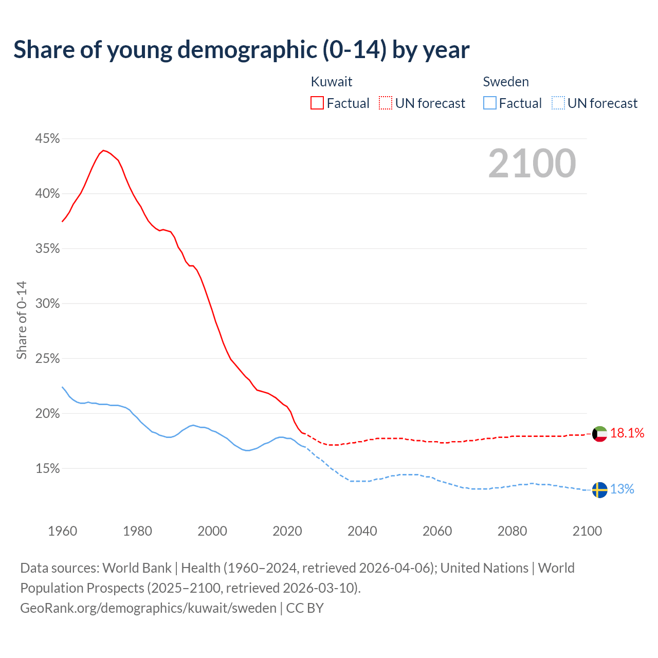 Median age Kuwait vs Sweden, 1960-2100
