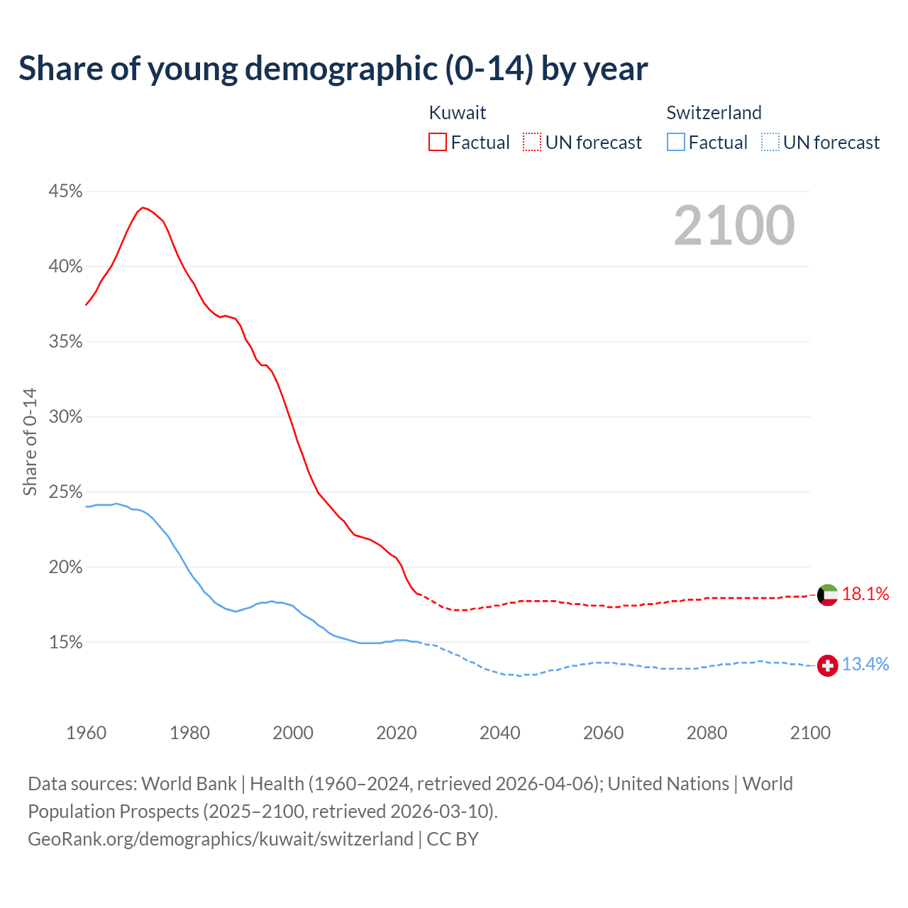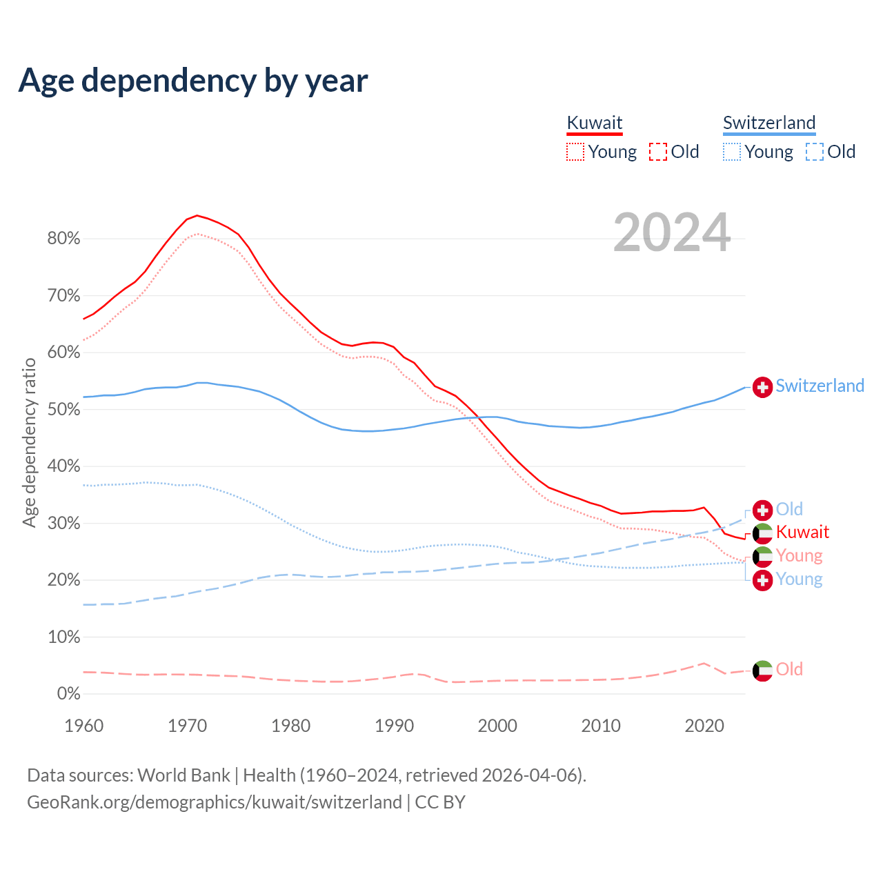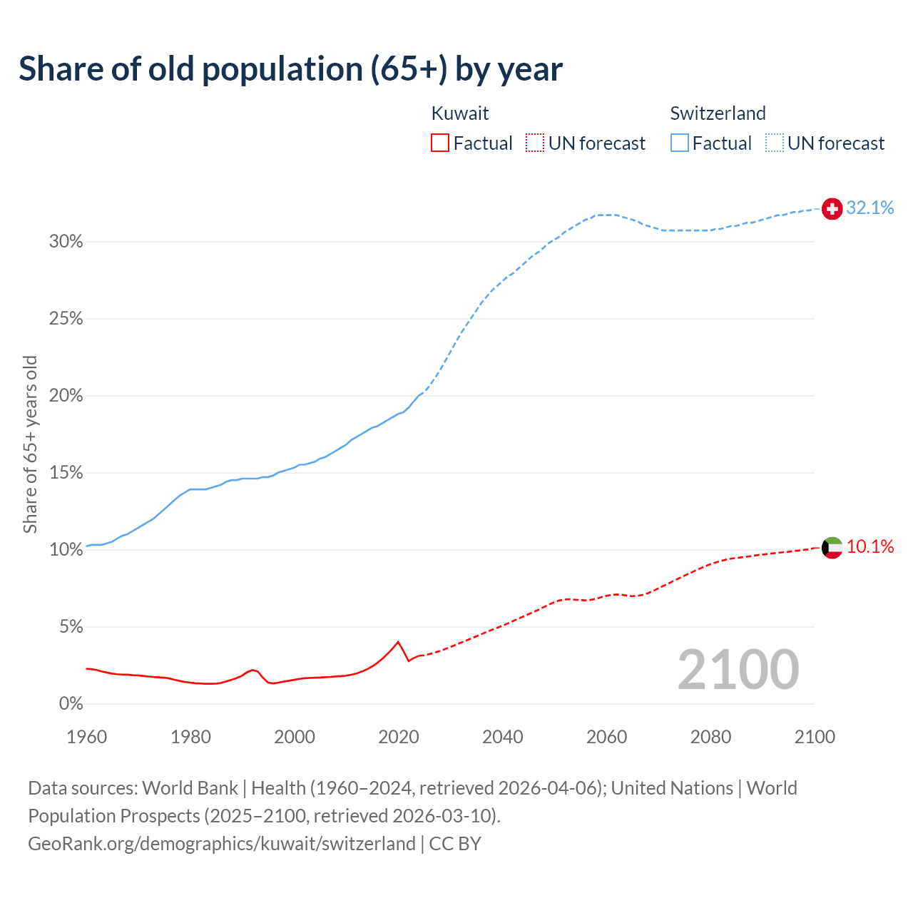The share of older people aged 65 and over is 3.1% in Kuwait and 20% in Switzerland. Life expectancy in Kuwait compared to Switzerland .