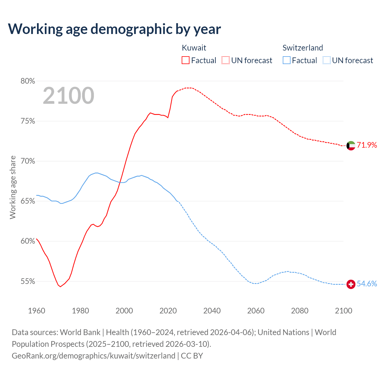 Median age Kuwait vs Switzerland, 1960-2100