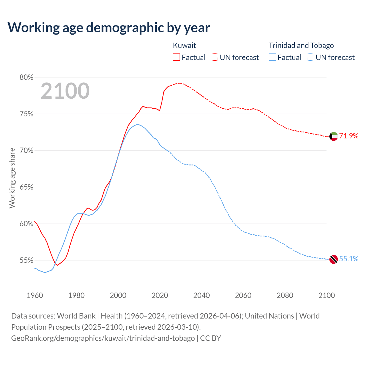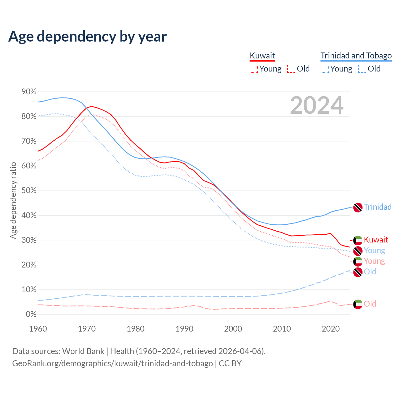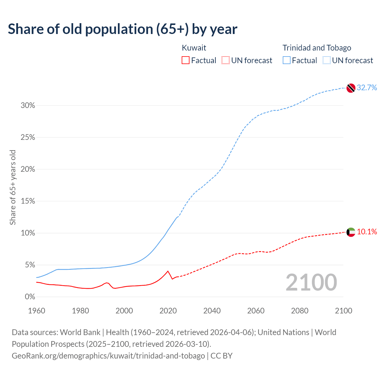 The share of older people aged 65 and over is 3.1% in Kuwait and 12.4% in Trinidad and Tobago. Life expectancy in Kuwait compared to Trinidad and Tobago .