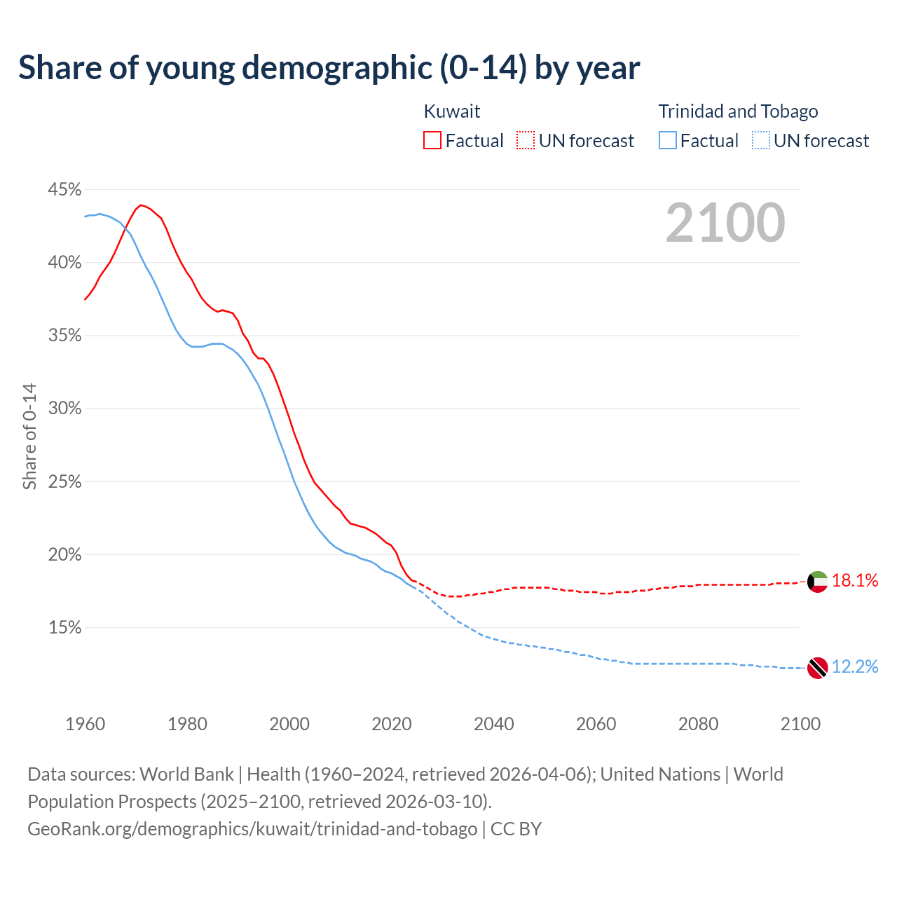 - The share of young demographic (0-15 years old) in Kuwait is 18.2% vs 17.8% in Trinidad and Tobago.