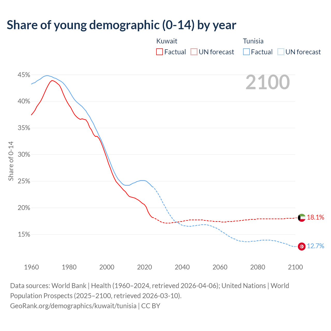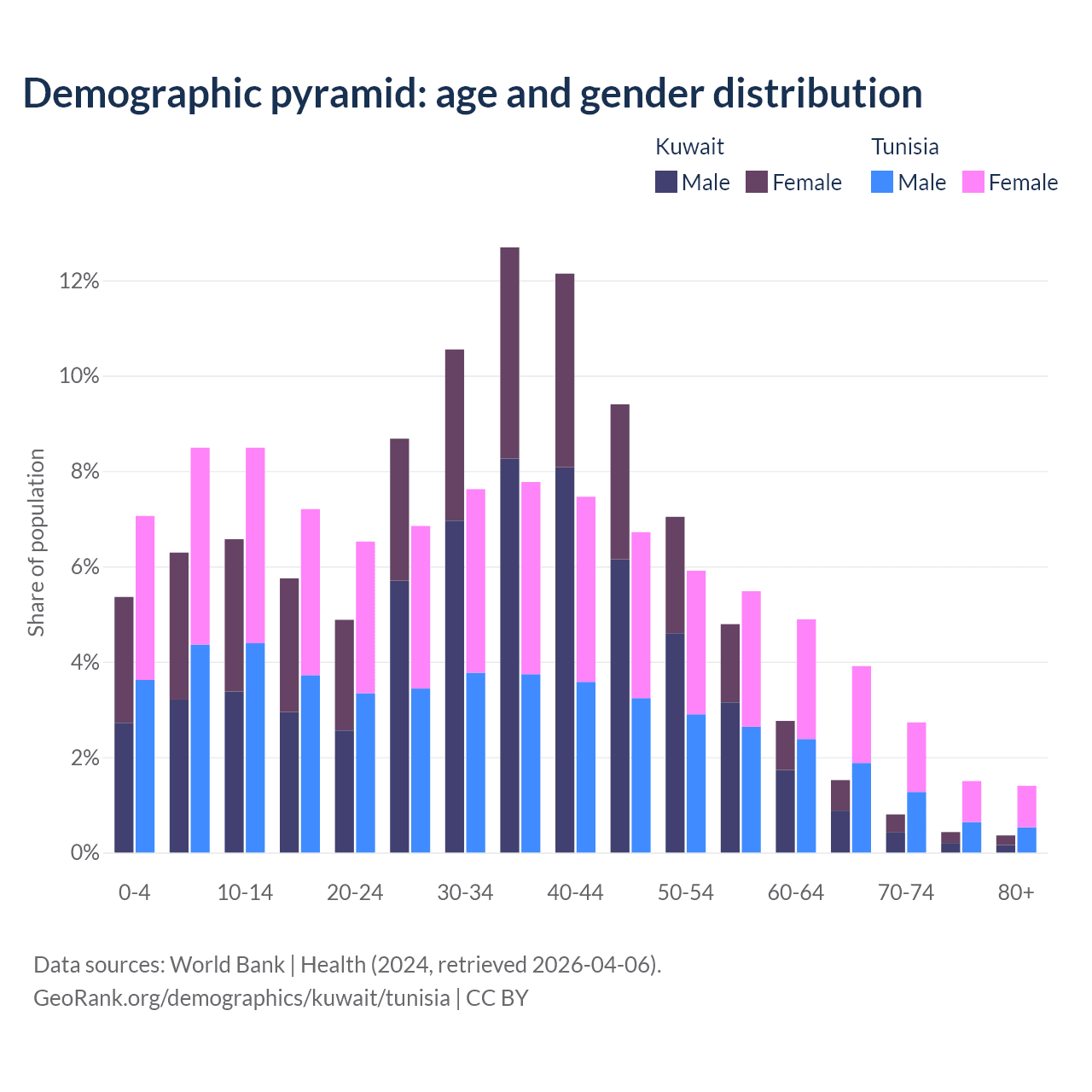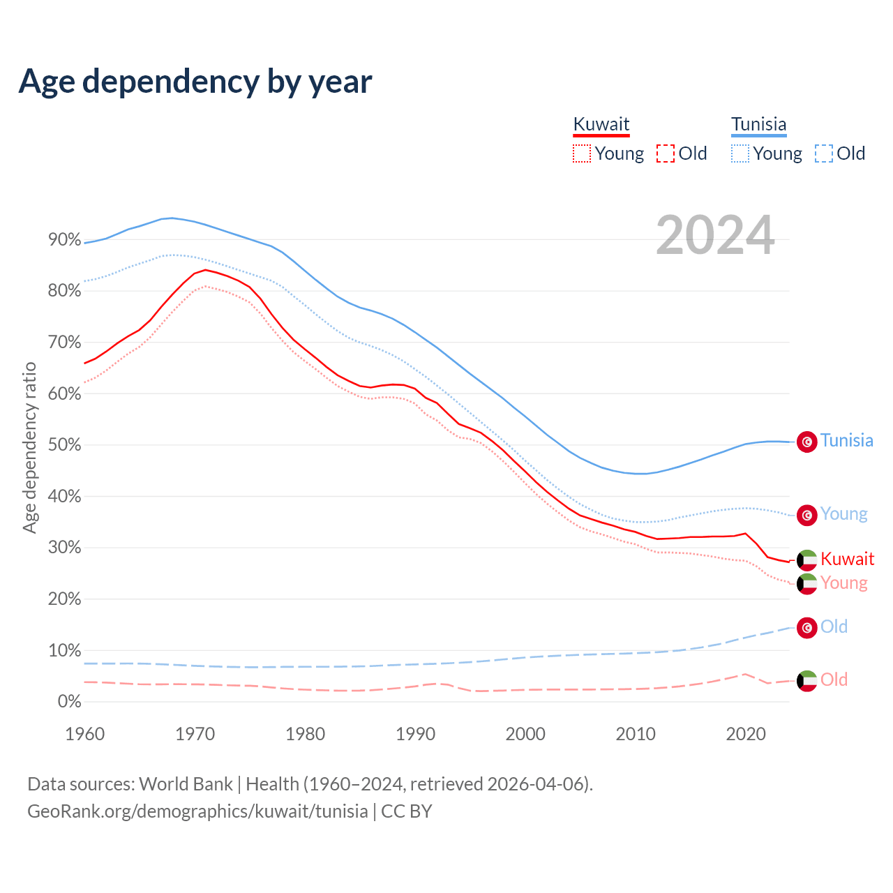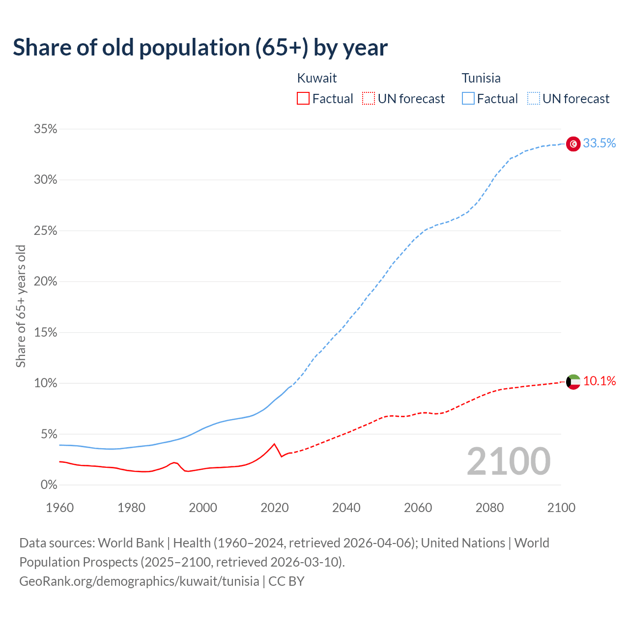 The share of older people aged 65 and over is 3.1% in Kuwait and 9.53% in Tunisia. Life expectancy in Kuwait compared to Tunisia .