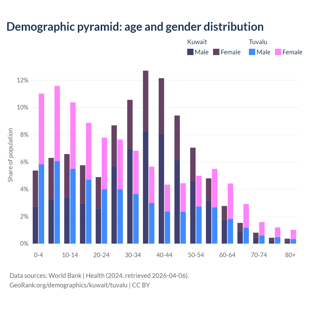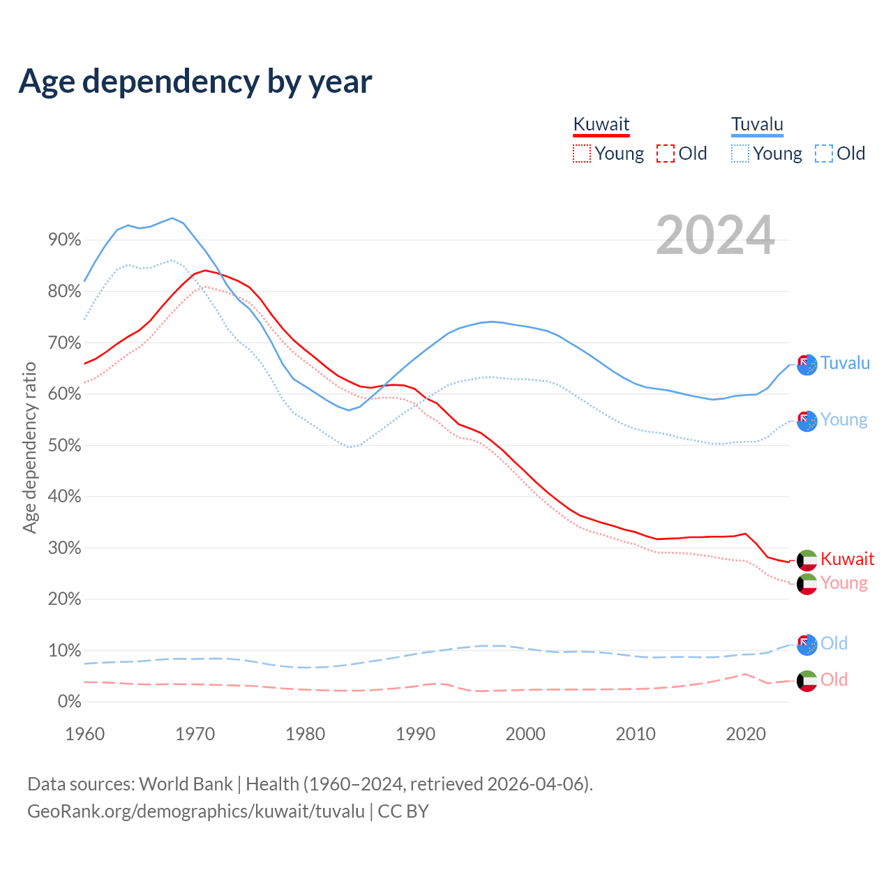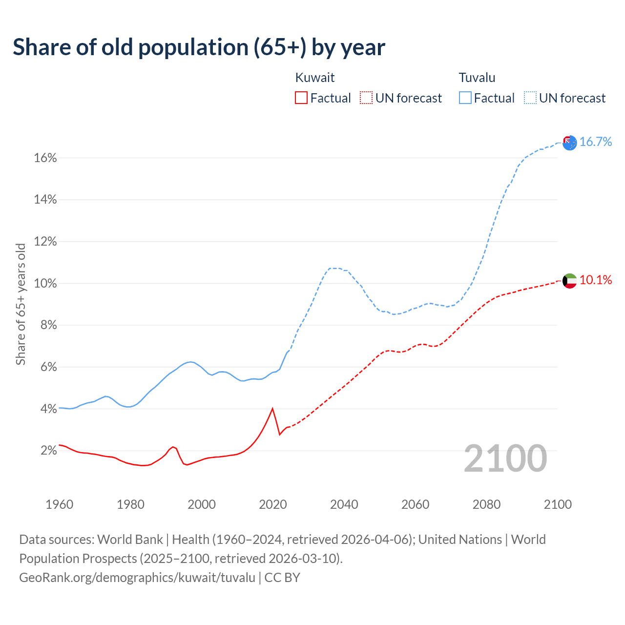 The share of older people aged 65 and over is 3.1% in Kuwait and 6.67% in Tuvalu. Life expectancy in Kuwait compared to Tuvalu .