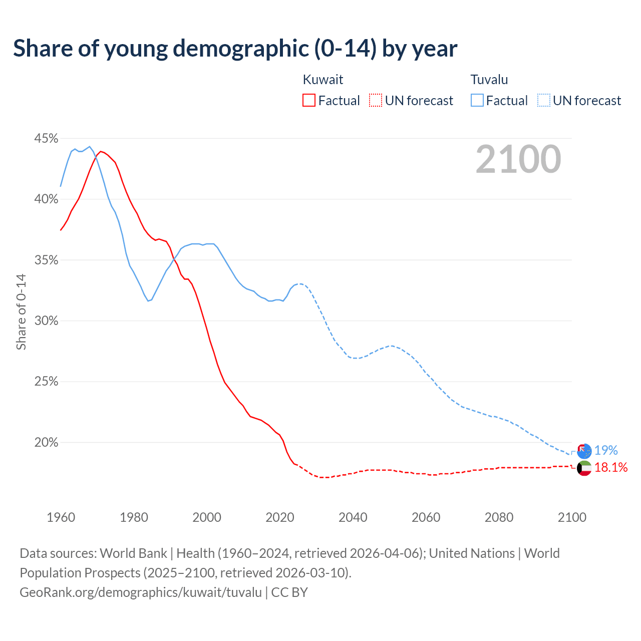 - The share of young demographic (0-15 years old) in Kuwait is 18.2% vs 32.9% in Tuvalu.